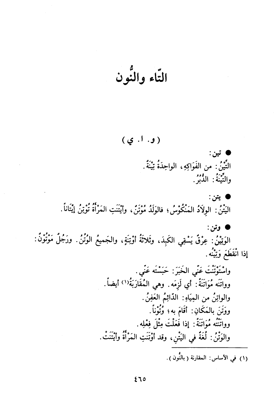 تين التَيْنُ : من الفَوَاكِهِ ، الواحِدَةُ تِيْنَة . والتِّيْنَة : الدبُر . يتن اليَتْنُ : الوِلادُ المَنْكُوْسُ ؛ فالوَلَدُ مُوْتَنٌ ، وأيْتَنَتِ المَرأةُ تُؤْينُ إيْتَاناً . وتن الوَتِيْنُ : عِرْقٌ يَسْقِي الكَبِدَ ، وثَلاثَةُ أوتنَةٍ ، والجَميعُ الوُتُنُ . ورَجُلٌ مَوْتُوْنٌ : إذا انْقَطَعَ وَييْنُه . واسْتَوْتَنْتَ عَنّي الخَبَرَ : حَبَسْتَه عَنّي . وواتَنَه مُوَاتَنَةً : أي لَزِمَه . وهي المُقَارَبَةُ أيضاً . والواتِنُ من المِيَاهِ : الدّائِمُ العَفِنُ . ووَتَنَ بالمَكَانِ : أقَامَ به ؛ وُتُوْناً . وواتَنْتُه مُوَاتَنَةً : إذا فَعَلْتَ مِثْلَ فِعْلِه . والوَتْنُ : لُغَةٌ في اليَتْنِ ، وقد أوْتَنَتِ المَرأةُ وأيْتَنَتْ .