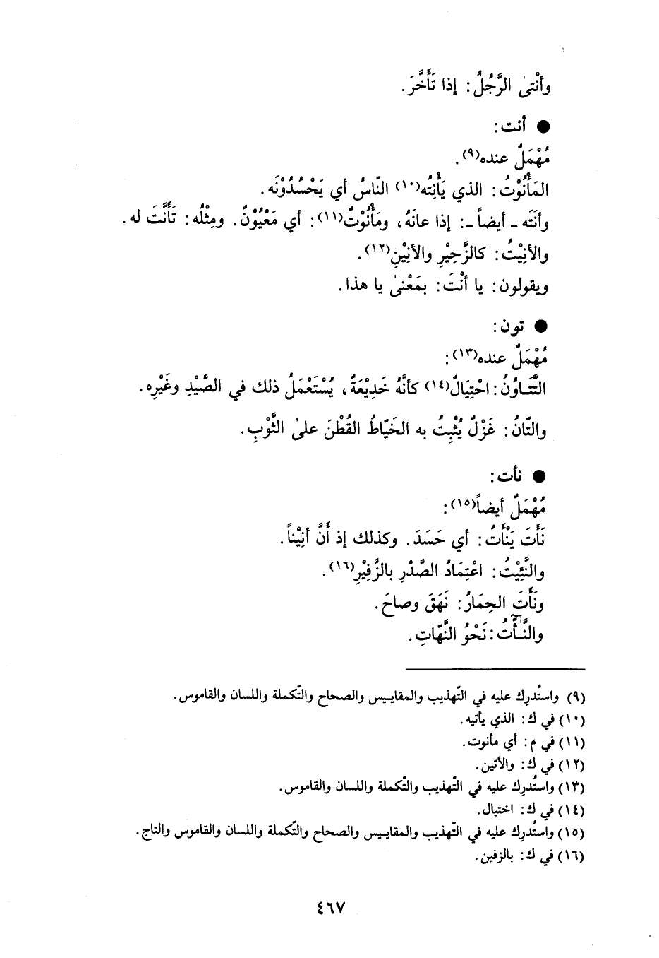 وأنْتى الرجُلُ : إذا تَأخَرَ . أنت مُهْمَلٌ عنده . المَأنوْتُ : الذي يَأنِتُه الناسُ أي يَحْسُدُوْنَه . وأنَتَه - أيضاً - : إذا عانَهُ ، ومَأنُوْتٌ : أي مَعْيُوْنٌ . ومِثْلُه : تَاءنَّتَ له . والأنِيْتُ : كالزَّحِيْرِ والأنِيْنِ . ويقولون : يا أنْتَ : بمَعْنى يا هذا . تون مُهْمَلٌ عنده : التتَاوُنُ : احْتِيَالٌ كأنهُ خَدِيْعَةٌ ، يُسْتَعْمَلُ ذلك في الصَّيْدِ وغَيْرِه . والتانُ : غَزْلٌ يُثْبِتُ به الخَيّاطُ القُطْنَ على الثَّوْبِ . نأت مُهْمَلٌ أيضاً : نَأتَ يَنْأتُ : أي حَسَدَ . وكذلك إذ أنَّ أنِيْناً . والنئِيْتُ : اعْتِمَادُ الصَّدْرِ بالزَّفِيْرِ . ونَأتَ الحِمَارُ : نَهَقَ وصاحَ . والنَّتأتُ : نَحْوُ النَّهاتِ .
