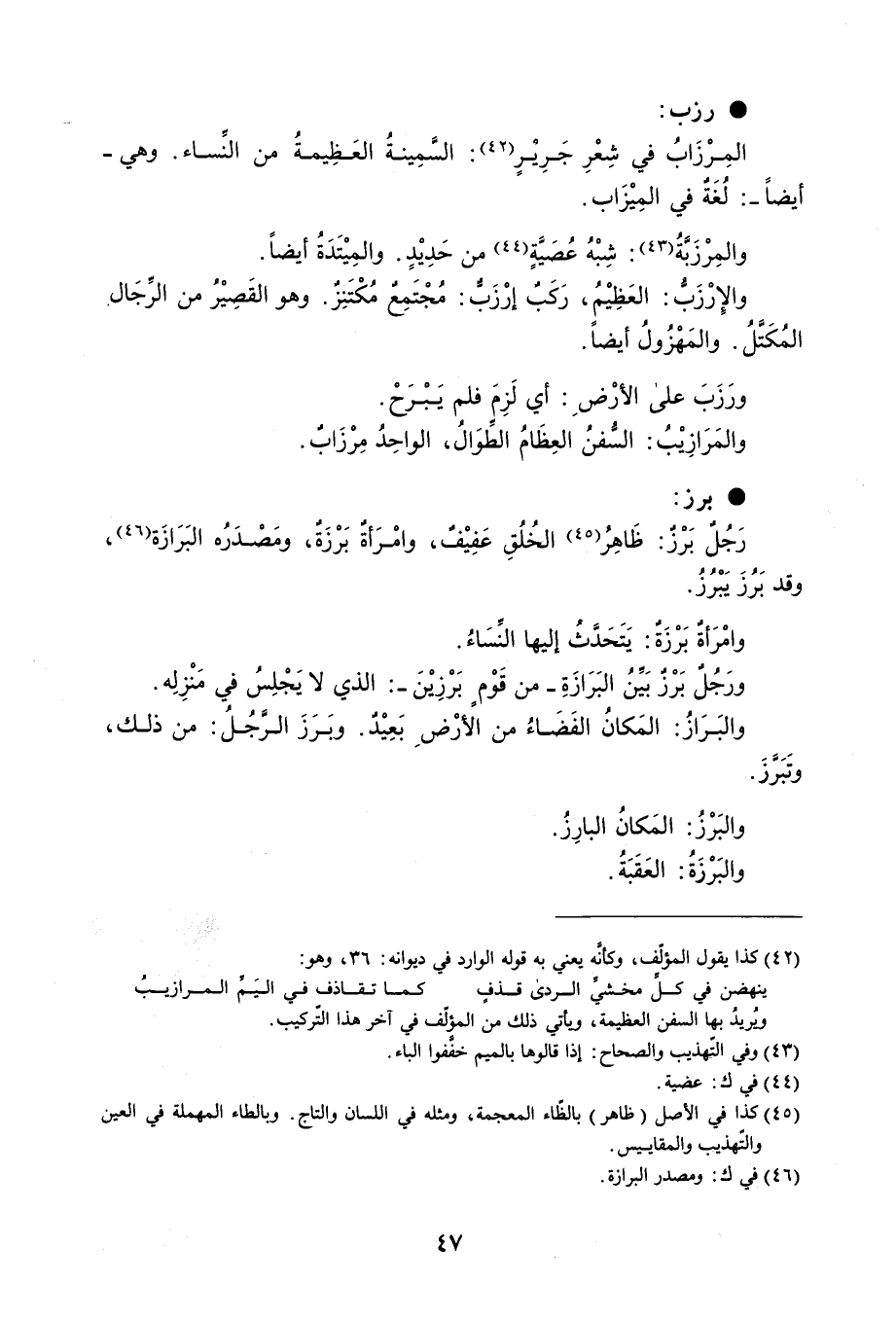 رزب المِرْزَابُ في شِعْرِ جَرِيرٍ : السَّمِينةُ العَظِيمةُ من النِّساء . وهي - أيضاً - : لُغَةٌ في المِيْزَاب . والمِرْزَبةُ : شِبْهُ عُصَيَّةٍ من حَدِيْدٍ . والمِيْتَدَةُ أيضاً . والإِرْزَبُ : العَظِيْمُ ، رَكَبٌ إرْزَبٌّ : مُجْتَمِعٌ مُكْتَنِزٌ . وهو القَصِيْرُ من الرِّجَال المُكَتَلُ . والمَهْزُولُ أيضاً . ورَزَبَ على الأرْضِ : أي لَزِمَ فلم يَبْرَحْ . والمَرَازِيْبُ : السُفنُ العِظَامُ الطِّوَالُ ، الواحِدُ مِرْزَاب . برز رَجُلٌ بَرْزٌ : ظَاهِر الخُلُقِ عَفِيْفٌ ، وامْرَأةٌ بَرْزَةٌ ، ومَصْدَره البَرَازَة ، وقد بَرُزَ يَبْرُزُ . وامْرَأة بَرْزَةٌ : يَتَحَدَّثُ إليها النِّسَاءُ . ورَجُلٌ بَرْزٌ بَيِّنُ البَرَازَةِ - من قَوْمٍ بَرْزِيْنَ - : الذي لا يَجْلِسُ في مَنْزِلِه . والبَرَازُ : المَكانُ الفَضَاءُ من الأرْضِ بَعِيْدٌ . وبَرَزَ الرَّجُلُ : من ذلك ، وتَبَرزَ . والبَرْزُ : المَكانُ البارِزُ . والبَرْزَةُ : العَقَبَةُ .