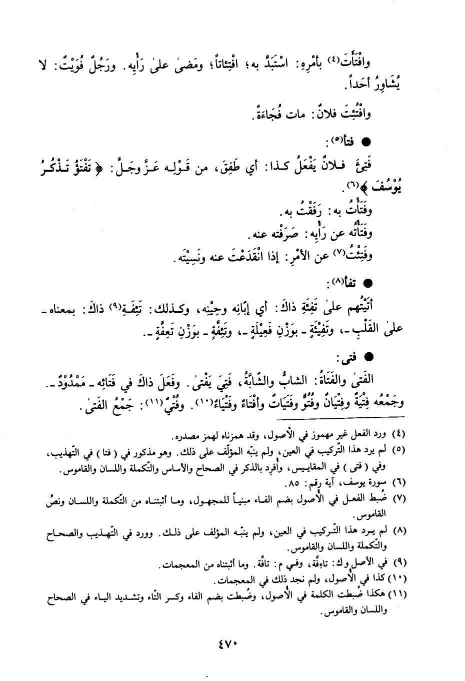 وافْتَأتَ بأمْرِهِ : اسْتَبَد به ؛ افْتِئاتاً ؛ ومَضى على رَأيِه . ورَجُلٌ فُوَيْتٌ : لا يُشَاوِرُ أحَداً . وافْتُئِتَ فلانٌ : مات فُجَاءَةً . فتأ فَتِئ فلان يَفْعَلُ كذا : أي طَفِقَ ، من قَوْلِه عَزَّوجَلَّ : ' تَفْتَؤُ تَذْكُرُ يُوْسُفَ ' . وفَتَأتُ به : رَفَقْتُ به . وفَتَأتُه عن رَأيِه : صَرَفْته عنه . وفَتِئْتُ عن الأمْرِ : إذا انْقَدَعْتَ عنه ونَسِيْتَه . تفأ أتَيْتُهم على تَفِئَةِ ذاكَ : أي إتجانِه وحِيْنِه ، وكذلك : تَثِفَةِ ذاكَ : بمعناه - على القَلْبِ - ، وتَفِيْئَةٍ - بوَزْنِ فَعِيْلَةٍ - ، وتَئفة - بوَزْنِ تَعِفَّةٍ - . فتى الفَتى والفَتَاةُ : الشاب والشّابَّةُ ، فَتِيَ يَفْتى . وفَعَلَ ذاكَ في فَتَائِه - مَمْدُوْد - . وجَمْعُه فِتْيَة وفِتْيَان وفُتُو وفَتَيَاتٌ وأفْتَاءٌ وفَتْيَاء . وفُتْيٌ : جَمْعُ الفَتى .