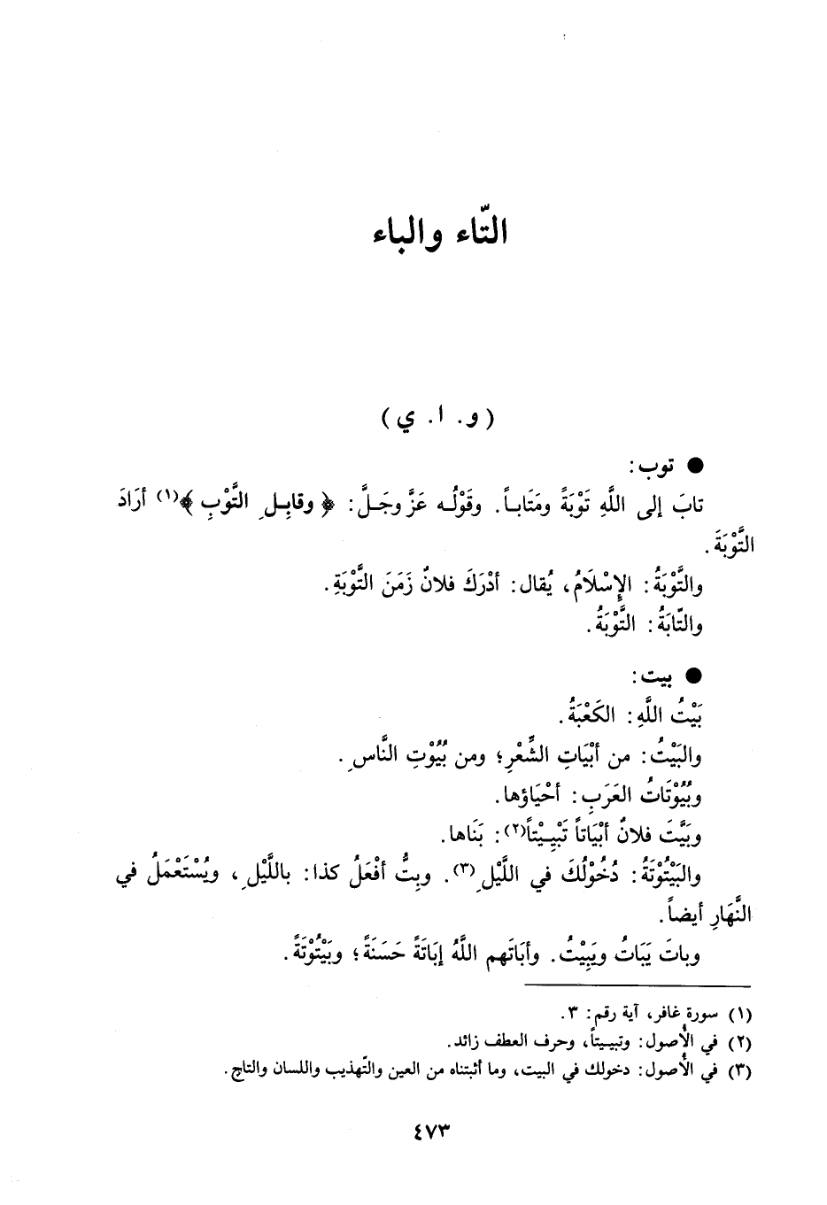 توب تابَ إلى اللَّهِ توبة ومَتَاباً . وقَوْله عَزَّوجَلَّ : ' وقابِل التوب ' أراد التوبة . والتوبة : الإسْلاَمُ ، يُقال : أدْرَكَ فلانٌ زَمَنَ التَّوْبَةِ . والتّابَةُ : التوْبَةُ . بيت بَيْتُ اللهِ : الكَعْبَةُ . والبَيْتُ : من أبْيَاتِ الشعْرِ ؛ ومن بُيوْتِ النَّاسِ . وبيُوْتَاتُ العَرَبِ : أحْيَاؤها . وبَيتَ فلانٌ أبْيَاتاً تَبْيِيْتاً : بَنَاها . والبَيْتُوْتَةُ : دُخُوْلُكَ في اللَّيْلِ . وبِتُّ أفْعَلُ كذا : باللَّيْلِ ، وُيسْتَعْمَلُ في النَهَارِ أيضاً . وباتَ يَبَاتُ وَيبِيْتُ . وأبَاتَهم اللَّهُ إبَاتَة حَسَنَةً ؛ وبَيْتُوْتَةً .
