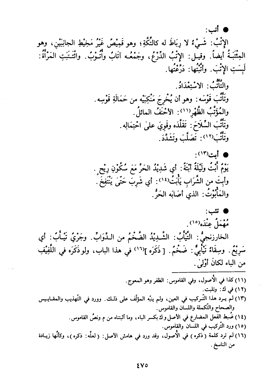 أتب : الإتْبُ : شَيْء لا رِبَاطَ له كالتِّكَّةِ ؛ وهو قَمِيْصٌ غَيْرُ مَخِيْطِ الجانِبَيْنِ ، وهو المِئْتَبَةُ أيضاً . وقيل : الإتْبُ الدَرْعُ ، وجَمْعُه آتَابٌ وأتُوْب . وائْتَتَبَتِ المرأةُ : لَبِسَتِ الِإتْبَ . وأتبْتُها : دَرَّعْتُها . والتأتُّبُ : الاسْتِعْدَادُ . وتَأتَبَ قَوْسَه : وهو أن يُخْرِجَ مَنْكِبَيْه من حَمَالَةِ قَوْسِه . والمُؤَتَبُ الظَّهْرِ : الأحْنَفُ المائلُ . وتَأتبَ السلاَحَ : تَقَلَّدَه وقَوِيَ على احْتِمَالِه . وتَأتَبَ : تَصَلبَ وتَشَددَ . أبت يَوْمٌ أبْتٌ ولَيْلَة أبْتَةٌ : أي شَدِيْدُ الحَرِّ مَعَ سُكُوْنِ رِيْحٍِ . وأبِتَ من الشرَاب يَأبَتُ : أي شَرِبَ حَتّى يَنْتَفِخ . والمَأبُوْتُ : الذيَ أصَابَه الحَرُّ . تئب مُهْمَلٌ عِنْدَه . الخارزنجي : التيْابُ : الشَّدِيْدُ الضخْمُ من الدوَابِّ . وجَرْيٌ تَيْأبٌ : أي سَرِيْع . وسِقَاء تَيْأبِي : ضَخْمٌ ذَكَرَه في هذا الباب ، ولوذَكَرَه في اللفِيْفِ من الباء لكانَ أوْلى .