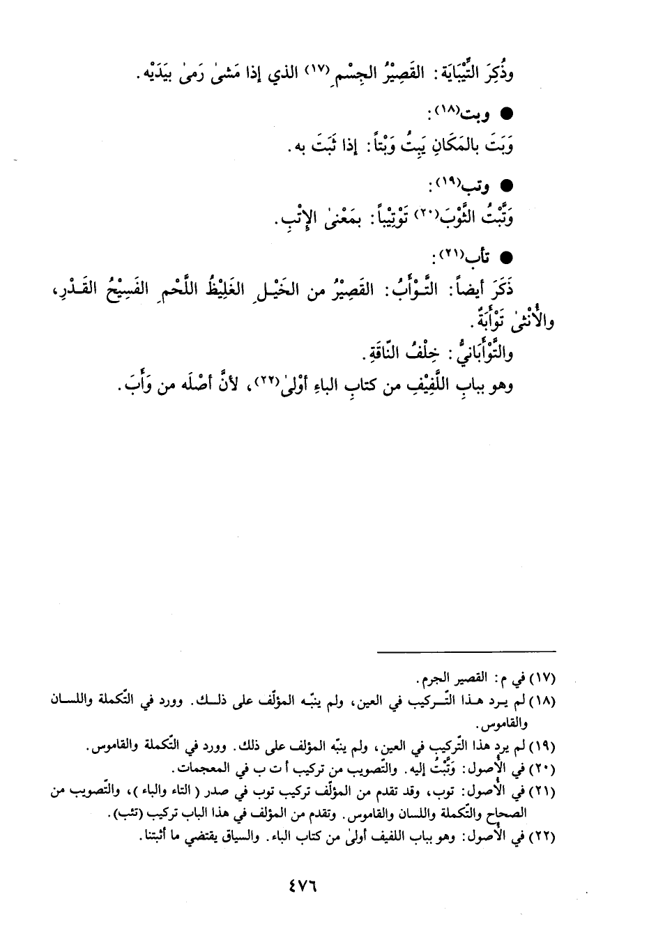 وذُكِرَ التَيْبَايَة : القَصِيْرُ الجِسْمِ الذي إذا مَشى رَمى بيَدَيْه . وبت وَبَتَ بالمَكَانِ يَبِتُ وَبْتاً : إذا ثَبَتَ به . وتب وَتَّبْتُ الثَّوْبَ تَوْتِيْباً : بمَعْنى الإِتْبِ . تاب ذَكَرَ أيضاً : التَّوابُ : القَصِيْرُ من الخَيْلِ الغَلِيْظُ اللَحْمِ الفَسِيْحُ القَدْرِ ، والأنْثى تَوابَةٌ . والتَّوأبَانيُّ : خِلْفُ النّاقَةِ . وهو ببابِ اللَّفِيْفِ من كتابِ الباءِ أوْلى ، لأنَ أصْلَه من وَأبَ .