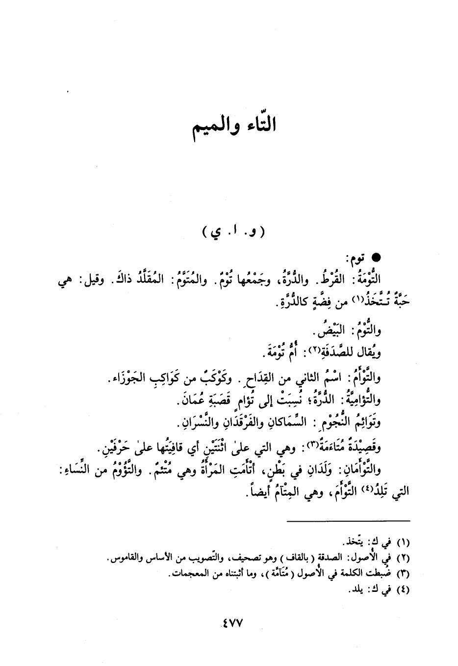 توم التُوْمَةُ : القُرْطُ . والدرةُ ، وجَمْعُها تُوْم . والمُتَوَّمُ : المُقَلدُ ذاكَ . وقيل : هي حبة تُتخَذُ من فِضةٍ كالدرةِ . والتُّوْمُ : البَيْضُ . وُيقال للصَّدَفَةِ : أم تُوْمَةَ . والتوْامُ : اسْمُ الثاني من القِدَاحِ . وكَوْكَبٌ من كَوَاكِبِ الجَوْزَاء . والتؤامِيَّةُ : الدرة ؛ نُسِبَتْ إلى تُؤامٍ قَصَبَةِ عُمَانَ . وتَوَائِمُ النُّجُوْمِ : السمَاكانِ والفَرْقَدَانِ والنَّسْرَانِ . وقَصِيْدَةٌ مُتَاءَمَةٌ : وهي التي على اثْنَتَيْن أي قافِيَتُها على حَرْفَيْنِ . والتوأمَانِ : وَلَدَانِ في بَطْن ، أتْأمَتِ المَرأةُ وهي مُتْئم . والتَّؤُوْمُ من النِّسَاءِ : التي تَلِدُ التوأمَ ، وهي المِتْآمًُ أيضاً .