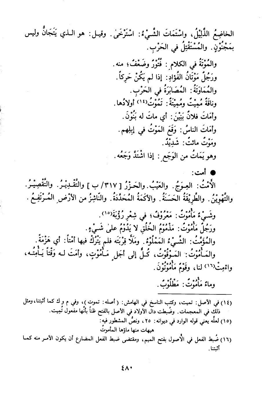 الخاضِعُ الذَّلِيْلُ ، واسْتَمَاتَ الشيْءُ : اسْتَرْخَى . وقيل : هو الذي يَتَجَانُ وليس بمَجْنُوْنٍ . والمُسْتَقْتِلُ في الحَرْبِ . والمُوْتَةُ في الكلامِ : فُتُوْر وضَعْفٌ ؛ منه . ورَجُل مَوْتَانُ الفُؤادِ : إذا لم يَكنْ حَرِكاً . والمُمَاوَتَةُ : المُصَابَرَةُ في الحَرْب . وناقَةٌ مُمِيْتٌ ومُمِيْتَةٌ : تَمُوْتُ أولادُها . وأمَاتَ فلانٌ بَنِيْنَ : أي ماتَ له بَنُوْنَ . وأمَاتَ الناسُ : وَقَعَ المَوتُ في إبِلِهم . ومَوْتٌ مائتٌ : شَدِيْد . وهو يَمَاتُ من الوَجَعِ : إذا اشْتَدَّ وَجَعُه . أمت الأمْتُ : العِوَجُ . والعَيْبُ . والحَزْرُ والتَّقْدِيْرُ . والتَّقْصِيْرُ . والتَهْوِيْنُ . والطَرِيْقَةُ الحَسَنَةُ . والأكَمَةُ المُحَدَّدَةُ . والنّاشِزُ من الأرْضِ المُرْتَفِعُ . وشَيْءٌ مَأمُوْتٌ : مَعْرُوْفٌ ؛ في شِعْرِرُؤْبَةَ . ورَجُلٌ مَأمُوْتٌ : مَذْمُوْمُ الخُلُقِ لا يَدُوْمُ على شَيْءٍ . والمُؤَمتُ : الشيْءُ المَمْلُوْءُ . ومَلاقِرْبَتَه فلم يَتْرُكْ فيها أمْتاً : أي هَزْمَةً . والمَأمُوْتُ : المَوْقُوْتُ ، كُل إلى أجَلٍ مَأمُوْتٍ ، وأمَتَ له وَقْتاً يَأمِتُه ، واءمِتْ لنا ، وقَوْمٌ مَأمُوْتُوْنَ . وماة مَأمُوْت : مَطْلُوْب .