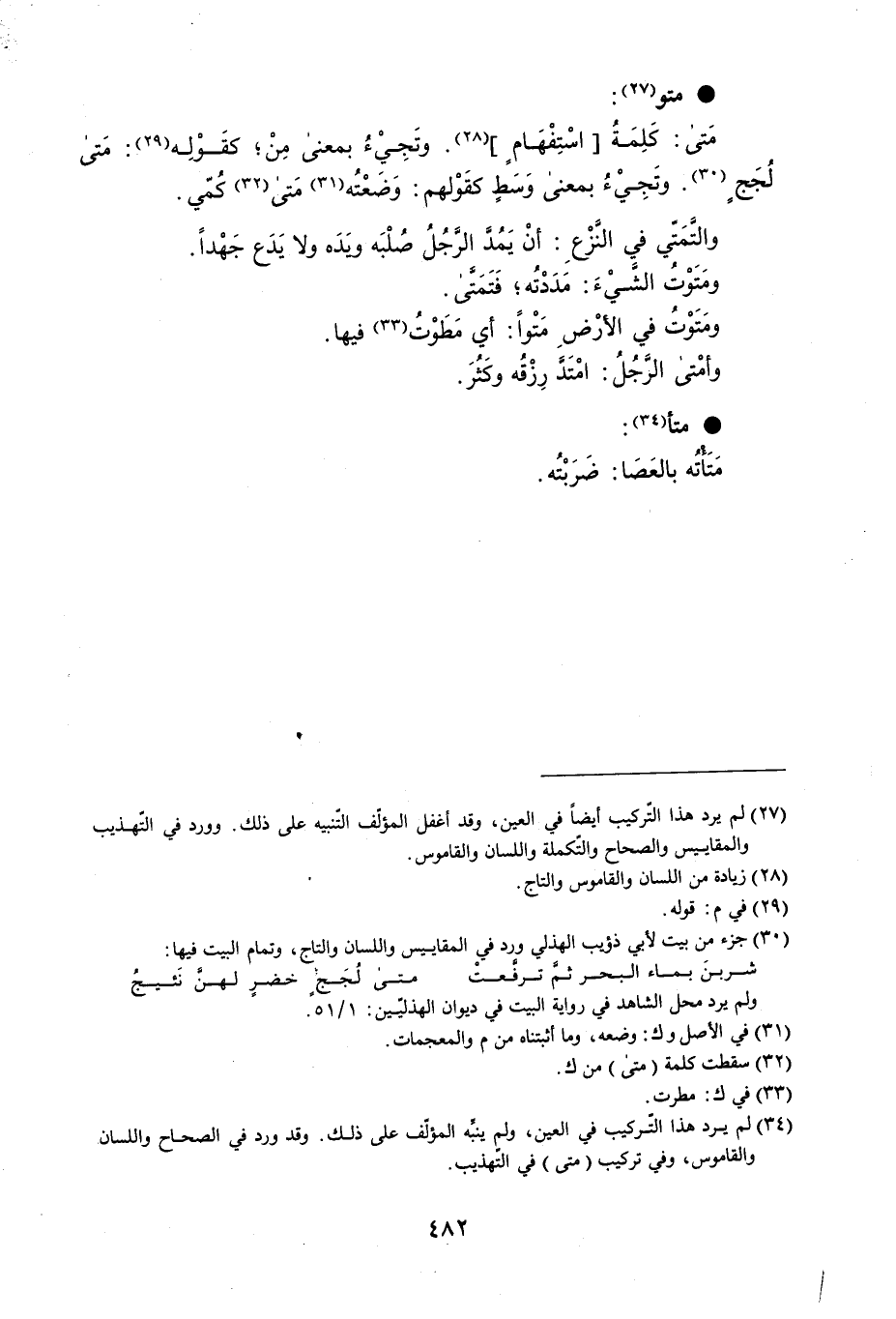 متو : مَتى : كَلِمَةُ اسْتِفْهَامٍ . وتَجِيْءُ بمعنى مِنْ ؛ كقَوْلِه متى لُجَجٍ . وتَجِيْءُ بمعنى وَسَطٍ كقَوْلهم : وَضَعْتُه مَتى كُمّي . والتَّمَتّي في النَزْعِ : أنْ يَمُدَّ الرَّجُل صلْبَه ويَدَه ولا يَدَع جَهْداً . ومَتَوْتُ الشَّيْءَ : مَدَدْتُه ؛ فَتَمَتَّن . ومَتَوْتُ في الأرْضِ مَتْواً : أي مَطَوْتُ فيها . وأمْتى الرجُلُ : امْتَدَّ رِزْقه وكَثُرَ . متأ مَتَأتُه بالعَصَا : ضَرَبْتُه .