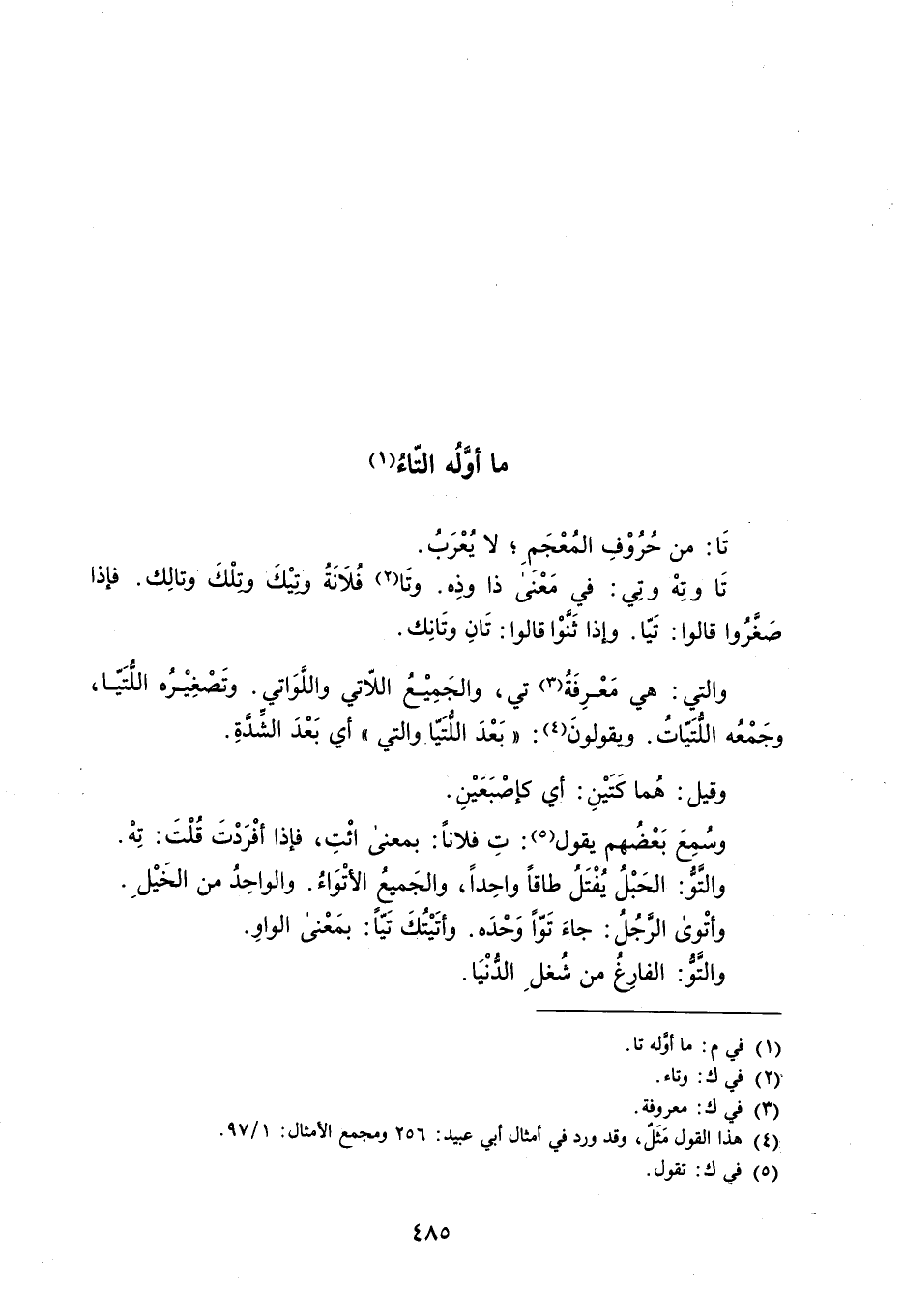تَا : من حُرُوْفِ المُعْجَمِ ؛ لا يُعْرَبُ . تَا وتِهْ وتِي : في مَعْنَى ذا وذِه . وتَا فُلانَةُ وتيْكَ وتلْكَ وتالِك . فإذا صغَرُوا قالوا : تَيّا . وإذا ثَنَّوْا قالوا : تَانِ وتَانِك . والتي : هي مَعْرِفَةُ تي ، والجَمِيْعُ اللّاتي واللَّوَاتي . وتَصْغِيْرُه اللُّتَيّا ، وجَمْعُه اللُّتَيّاتُ . ويقولونَ : ' بَعْدَ اللُّتَيّا والتي ' أي بَعْدَ الشِّدَّةِ . وقيل : هُما كَتَيْنِ : أي كإصْبَعَيْنِ . وسُمِعَ بَعْضُهم يقول : تِ فلاناً : بمعنى ائْتِ ، فإذا أفْرَدْتَ قُلْتَ : تِهْ . والتَّوُّ : الحَبْلُ يُفْتَلُ طاقاً واحِداً ، والجَميعُ الأتْوَاءُ . والواحِدُ من الخَيْلِ . وأتْوى الرجُلُ : جاءَ تَوّأ وَحْدَه . وأتَيْتُكَ تَيّاً : بمَعْنى الواوِ . والتَّوُّ : الفارغ من شُغلِ الدُنْيَا .