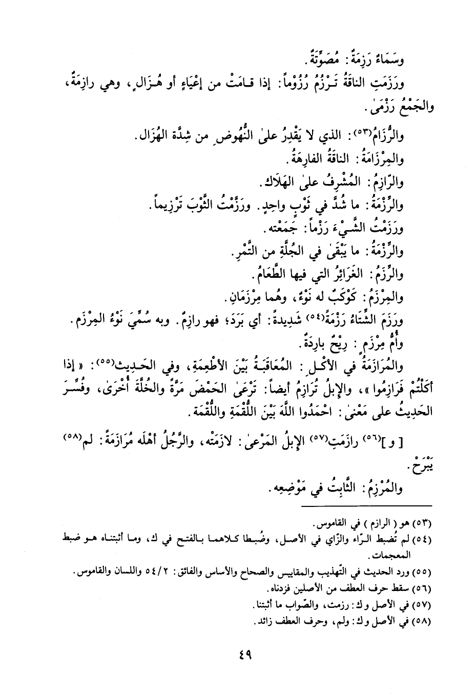 وسَمَاءٌ رَزِمَةٌ : مُصَوِّتَة . ورَزَمَتِ الناقَةُ تَرْزُمُ رُزُوْماً : إذا قامَتْ من إعْيَاء أو هُزَالٍ ، وهي رازِمَةٌ ، والجَمْعُ رَزْمَن . والرزَامُ : الذي لا يَقْدِرُ على النُّهُوضِ من شِدَّة الهُزَال . والمِرْزَامَةُ : الناقَةُ الفارِهَةُ . والرازِمُ : المُشْرِفُ على الهَلاَك . والرزْمَة : ما شُدَّ في ثَوْبٍ واحِدٍ . ورَزَّمْتُ الثوْبَ تَرْزِيماً . ورَزَمْتُ الشيْءَ رَزْماً : جَمَعْته . والرزْمَةُ : ما يَبْقَى في الجُلَةِ من التَّمْرِ . والرزَمُ : الغَرَائِرُ التي فيها الطَّعَامُ . والمِرْزَمُ : كَوْكَبٌ له نَوء ، وهُما مِرْزَمَانِ . ورَزَمَ الشتَاءُ رَزْمَةً شَدِيدةً : أي بَرَدَ فهو رازِمٌ . وبه سمِّيَ نَوْءُ المِرْزَم . وأم مِرْزَم : رِيْحٌ بارِدَةٌ . والمُرَازَمَةً في الأكْلِ : المُعَاقَبَةُ بَيْنَ الأطْعِمَةِ ، وفٍي الحَدِيث : ' إذا أكَلْتُمْ فَرَازِمُوا ' ، والإبلُ تُرَازِمُ أيضاً : تَرْعَى الحَمْضَ مَرة والخُلةَ أخْرَى ، وفُسِّرَ الحَدِيثُ على مَعْنى : احْمَدُوا اللهَ بَيْنَ اللُّقْمَةِ واللُّقْمَة . و رازَمَتِ الإبلُ المَرْعى : لازَمَتْه ، والرَّجُلُ أهْلَه مُرَازَمَةً : لم يبرح . والمُرْزِمُ : الثابِتُ في مَوْضِعِه .