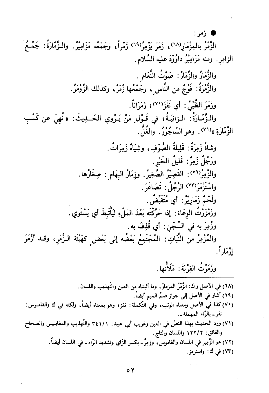 زمر الزمْرُ بالمِزْمَارِ ، زَمَرَ يَزْمِرُ زَمْراً ، وجَمْعُه مَزَامِيْرُ . والزَّمّارَة : جَمع الزامِرِ . ومنه مَزَامِيْرُ داوُوْدَ عليه السَّلام . والزمَارُ والزمَارُ : صَوْتُ النَّعَامِ . والزُّمْرَة : فَوْجَ من الناسِ ، وجَمْعُها زُمَر ، وكذلك الزوْمَرُ . وزَمَرَ الظبْيُ : أي نَفَزَ ؛ زَمَرَاناً . والزَّمارَةُ : الزانِيَةُ ؛ في قَوْلِ مَنْ يَرْوِي الحَدِيثَ : ' نُهِيَ عن كَسْب الزَمارَةِ ' . وهو السّاجُوْرُ . والغُلُّ . وشاةٌ زَمِرَةٌ : قَلِيلةُ الصُّوْفِ ، وشِيَاهٌ زَمِرَاتٌ . ورَجُلٌ زَمِرٌ : قَليلُ الخَيْرِ . والزمِرُ : القَصِيْرُ الضغِيرُ . وزِمَارُ البِهَامِ : صِغَارُها . واسترمز الرجل : تَصَاغَرَ . واستزمر . ولَحْم زَمَارِيْرُ : أي مُتَقَئفرٌ . وزَمْزَرْتُ الوِعَاءَ : إذا حَركْتَه بَعْدَ المَلْءِ ليَأتَبِطَ أي يَسْتَوي . وزُمِرَ به في السِّجْنِ : أي قُذِفَ به . والمُزْمِرُ من النبَاتِ : المُجْتَمِعُ بَعْضُه إلى بَعْضٍ كهَيْئَة الزُّمَرِ ، وقد أزْمَرَ إزْمَاراً . وزَمَرْتُ القِرْبَةَ : مَلأتها .