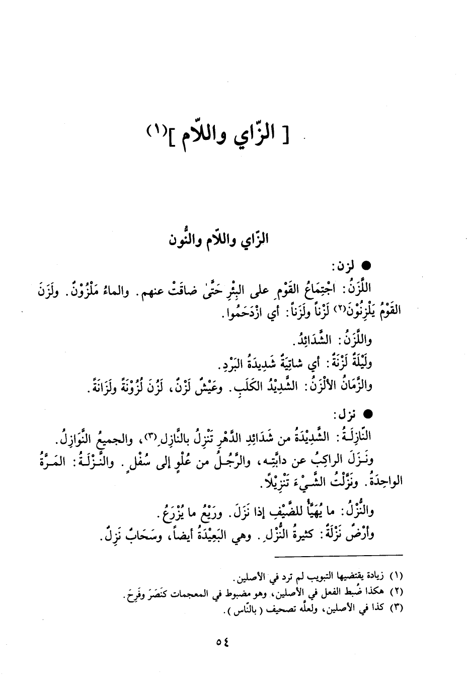 لزن اللَّزَنُ : اجْتِمَاع القَوْمِ على البِئْرِ حَتى ضاقَتْ عنهم . والماءُ مَلْزُوْنٌ . ولَزَنَ القَوْمُ يَلْزِنُوْنَ لَزْناً ولَزَناً : أي ازْدَحَمُوا . واللزَنُ : الشدَائِدُ . ولَيْلَة لَزْنَةٌ : أي شاتِيَة شَدِيدَةُ البَرْدِ . والزمَانُ الألْزَنُ : الشدِيْدُ الكَلَبِ . وعَيْشٌ لَزْنٌ ، لَزُنَ لُزُوْنَةً ولَزَانَةً . نزل النّازِلَةُ : الشَّدِيْدَةُ من شَدَائِدِ الدهْرِ تَنْزِلُ بالنَّازِلِ ، والجميعُ النوَازِلُ . ونَزَلَ الراكِبُ عن دابتِه ، والرجُلُ من عُلْوٍ إلى سُفْلٍ . والنَّزْلَةُ : المَرةُ الواحِدَةُ . ونَزًلْتُ الشَيْءَ تَنْزِيْلاً . والنُزْلُ : ما يُهَيأ للضيْفِ إذا نَزَلَ . ورَيْعُ ما يُزْرَعُ . وأرْض نَزْلَةٌ : كثيرةُ النُّزْلِ . وهي البَعِيْدَةُ أيضاً ، وسَحَابٌ نَزِل .