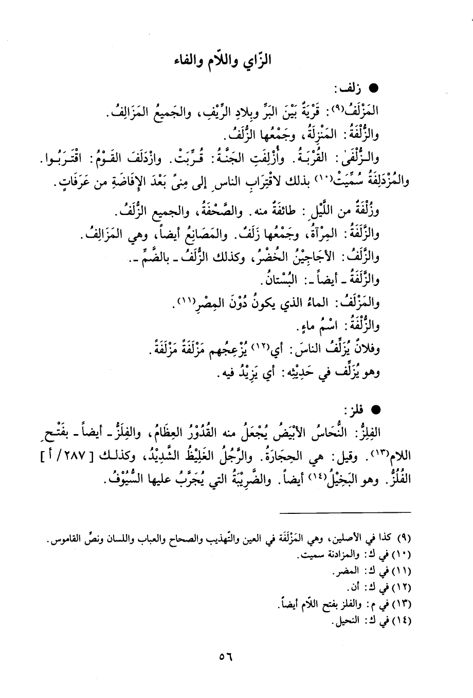 زلف المَزْلَفُ : قَرْيَةٌ بَيْنَ البَر وبِلادِ الرِّيْفِ ، والجَميعُ المَزَالِف . والزُلْفَةُ : المَنْزِلَةُ ، وجَمْعُها الزُّلَفُ . والزُّلْفَى : القُرْبَةُ . وأزْلِفً الجَنَّةُ : قُرِّبَتْ . وازْدَلَفَ القَوْمُ : اقْتَرَبُوا . والمُزْدَلِفَةُ سُمِّيَتْ بذلك لاقْتِرَابِ الناسِ إلى مِنىً بَعْدَ الإفَاضَةِ من عَرَفَاتٍ . وزُلْفَةٌ من اللَيْلِ : طائفَةٌ منه . والصَّحْفَةُ ، والجميِع الزُّلَفُ . والزَلَفَةُ : المِرْآةُ ، وجَمْعُها زَلَف . والمَصَانِعُ أيضاً ، وهي المَزَالِفُ . والزَلَفُ : الأجَاجِيْنُ الخُضْرُ ، وكذلك الزُّلَفُ - بالضَّمِّ - . والزَّلَفَةُ - أيضاً - : البُسْتان . والمَزْلَفُ : الماءُ الذي يكونُ دُوْنَ المِصْرِ . والزُلْفَةُ : اسْمُ ماءٍ . وفلانٌ يُزَلفُ الناسَ : أي يُزْعِجُهم مَزْلَفَةً مَزْلَفَةً . وهو يُزَلِّف في حَدِيْثِه : أي يَزِيْدُ فيه . فلز الفِلِزُ النُّحَاسُ الأبْيَضُ يُجْعَلُ منه القُدُوْرُ العِظَامُ ، والفِلَزُّ - أيضاً - بفَتْحِ اللام . وقيل هي الحِجَارَةُ . والرَّجُلُ الغَلِيْظُ الشَّدِيْدُ ، وكذلك الفُلُزُ . وهو البَخِيْلُ أيضاً . والضَّرِيْبَةُ التي يُجَرَّبُ عليها السيُوْفُ .