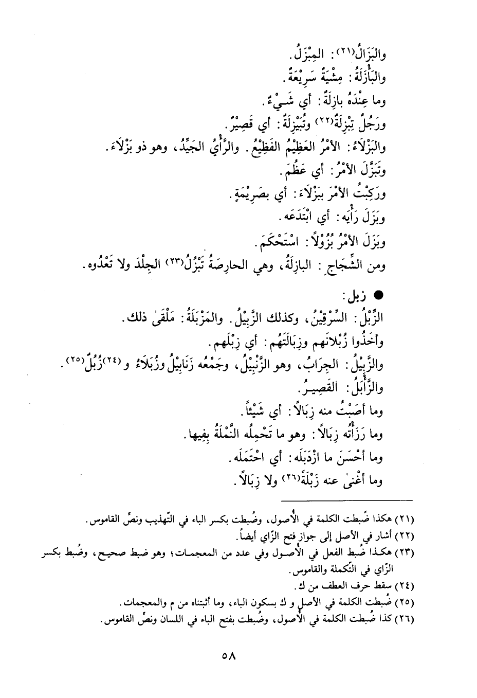 والبَزَالُ : المِبْزَل . والبَأزَلَةُ : مِشْيَةٌ سَرِيْعَةٌ . وما عِنْدَهُ بازِلَةٌ : أي شَيْءٌ . ورَجُلٌ تِبْزِلَةٌ وتبَيْزِلَةٌ : أي قَصِيْرٌ . والبَزْلَاءُ : الأمْرُ العَظِيْمُ الفَظِيْعُ . والرَّايُ الجَيِّدُ ، وهو ذو بَزْلَاءَ . وتَبَزَلَ الأمْرُ : أي عَظُمَ . ورَكِبْتُ الأمْرَ ببَزْلاَءَ : أي بصَرِيْمَةٍ . وبَزَلَ رَأيَه : أي ابْتَدَعَه . وبَزَلَ الأمْرُ بُزُوْلاَ : اسْتَحْكَمَ . ومن الشِّجَاجِ : البازِلَةُ ، وهي الحارِصَةُ تَبْزُلُ الجِلْدَ ولا تَعْدُوه . زبل الزِّبْلُ : السِّرْقِيْنُ ، وكذلك الزَّبِيْلُ . والمَزْبَلَةُ : مَلْقَى ذلك . وأخَذُوا زُبْلانَهم وزِبَالَتَهُم : أي زِبْلَهم . والزَبيْلُ : الجِرَابُ ، وهو الزَّنْبِيْلُ ، وجَمْعُه زَنَابِيْلُ وزُبَلاَءُ و زُبُلٌ والزاَبَلُ : القَصِيرُ . وما أصَبْت منه زِبَالاً : أي شَيْئاً . وما رَزَأْتُه زِبَالاً : وهو ما تَحْمِلُه النَّمْلَةً بِفِيها . وما أحْسَنَ ما ازْدَبَلَه : أي احْتَمَلَه . وما أغْنى عنه زَبْلَةً ولا زِبَالاً .