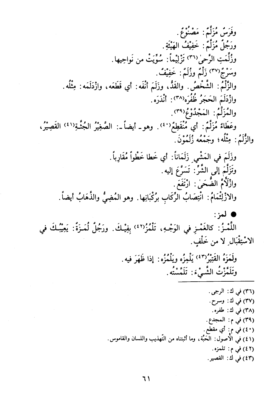 وفَرَسٌ مُزَلَّم : مَصْنُوْعٌ . ورَجُلٌ مُزَلًمٌ : خَفِيْفُ الهَيْئَةِ . وزُتَمَتِ الرحى تَزْلِيْماً : سُوِّيَتْ من نَواحِيها . وسَرْجٌ رَلْمٌ وزُلَمٌ : خَفيف . والزَّلْمُ : الشًخْصُ . والقَدُّ ، وزَلَمَ أنْفَه : أي قَطَعَه ، وازْدَلَمَه : مِثْلُه . وازْدَلَمَ الحَجَرُ ظُفُرَه : أنْدَرَه . والمُزَلمُ : المَجْدُوْعُ . وعَطَاءٌ مُزَلَّمٌ : أي مُنْقَطِعٌ وهو - أيضاً - : الصَّغِيْرُ إلجُثَّةِ القَصِيْرُ ، والزُلَمُ : مِثْلُه ؛ وجَمْعُه زُلَمُوْنَ . وزَلَمَ في المَشْيِ زَلَمَاناً : أي خَطا خَطْواً مُقَارِباً . وتَزَلم إلى الشَرِّ : تَسَرَّعَ إليه . وازْلأمَ الضحى : ارْتَفَعَ . والازْلِئْمَامُ : انْتِصَابُ الرِّكَابِ برُكْبَانِها . وهو المُضِيُّ والذَّهَابُ أيضاً . لمز اللَّمْزُ : كالغَمْزِ في الوَجْهِ ، تَلْمُزُ بِفِيْكَ . ورَجُلٌ لُمَزَة : يَعِيْبُكَ في الاسْتِقْبَالِ لا من خَلْق . ولَمَزَهُ القَتِيْرُ يَلْمِزُه وَيلْمُزُه : إذا ظَهَرَ فيه . وتَلَمَزْتُ الشيْءَ : تَلَمسْتُه .