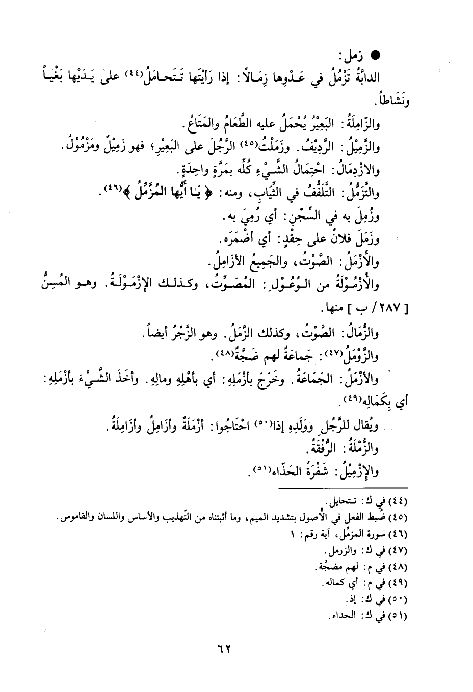 زمل الدابةُ تَزْمُلُ في عَدْوِها زِمَالاً : إذا رَأيْتَها تَتَحامَلُ على يَدَيْها بَغْياً ونَشَاطاً . والزّامِلَةُ : البَعِيْرُ يُحْمَلُ عليه الطَّعَامُ والمَتَاعُ . والزَمِيْلُ : الردِيْفُ . وزَمَلْتُ الرَّجُلَ على البَعِيْرِ ؛ فهو زَمِيْلٌ ومَزْمُوْلٌ . والازْدِمَالُ : احْتِمَالُ الشَّيْءِ كُلِّه بمَرَّةٍ واحِدَةٍ . والتَّزَمُلُ : التَلَفُّفُ في الثِّيَابِ ، ومنه : ' يَأ أيُّها المزَّمِّلُ ' وزُمِلَ به في السجْنِ : أي رُمِيَ به . وزَمَلَ فلانٌ على حِقْدٍ : أي أضمَرَه . والأزْمَلُ : الصَوْتُ ، والجَمِيعُ الأزَامِلُ . والأزْمُوْلَةُ من الوُعُوْلِ : المُصَوِّتُ ، وكذلك الإزْمَوْلَةُ . وهو المُسِنُ منها . والزُّمَالُ : الصَّوْتُ ، وكذلك الزَمَلُ . وهو الزَّجْرُ أيضاً . والزوْمَلُ : جَماعَةٌ لهم ضَجةٌ . والأزْمَلُ : الجَمَاعَةُ . وخَرَجَ بازْمَلِهِ : أي بأهْلِهِ ومالِهِ . وأخَذَ الشَّيْءَ بازْمَلِهِ : أي بِكَمَالِه . وُيقال للرجُلِ ووَلَدِه إذا احْتَاجُوا : أزْمَلَةٌ وأزَامِلُ وأزَامِلَةُ . والزُمْلَةُ : الرُفْقَةُ . والإزْمِيْلُ : شَفْرَةُ الحَذّاء .