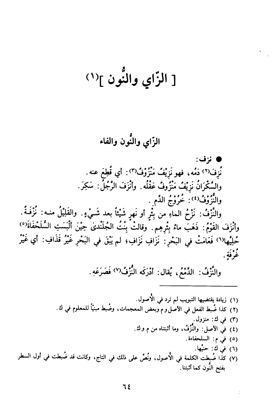 نزف نُزِفَ دَمُه ، فهو نَزِيْفٌ مَنْزُوْف أي قُطِعَ عنه . والسكْرَانُ نَزِيْف مَنْزُوف عَقْلُه . وأنْزَفَ الرَّجُلُ سَكِرَ . والنُّزُوْفُ خُرُوْج الدَّم . والنزْفُ : نَزْحُ الماءِ من بِئرٍ أو نَهرٍ شَيْئاً بعد شَيْءٍ . والقَلِيْلُ منه : نُزْفَةٌ . وأنْزَفَ القَوْمُ : ذَهَبَ ماءُ بِئْرِهِم . وقالتْ بِنْتُ الجُلَنْدى حِيْنَ ألْبَسَتِ السلَحْفَاةَ حُليها فَعَامَتْ في البَحْرِ : نَزَافِ نَزَافِ ؛ لم يَبْقَ في البَحْرِ غَيْرُ قَذَافِ : أي غَيْرُ غُرْفَة . والنزْفُ : الدَّمْعُ ، يُقال : أدْرَكَه النزْفُ فَصرَعَيما .