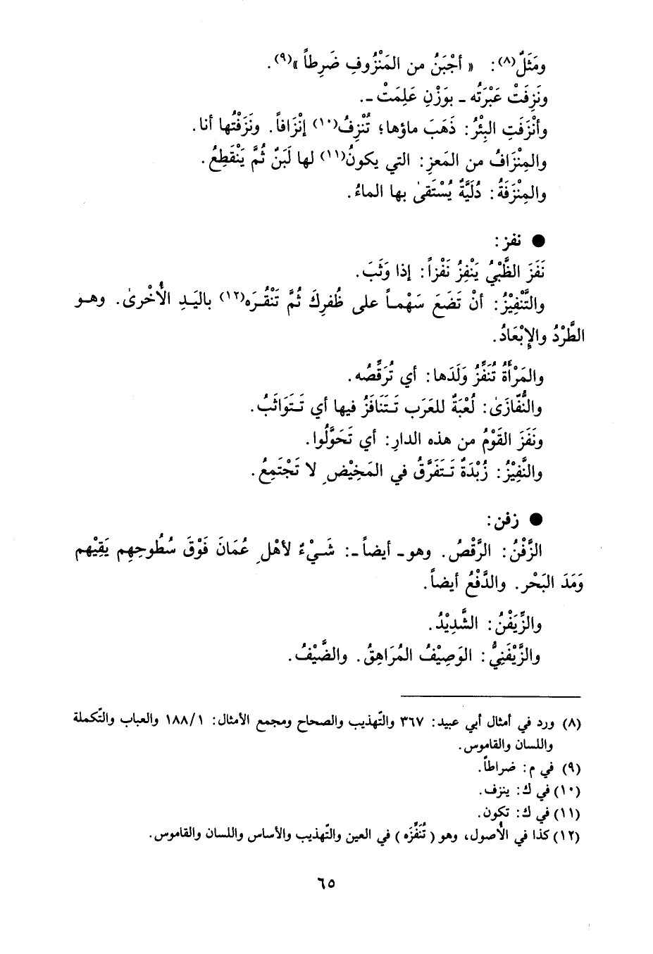 ومثل : ' أجبن من المنزوف ضرطاً ' ونزفت عبرته - بوزن علمت . وأنزفت البئر : ذَهَبَ ماؤها ؛ تُنْزِفُ إنْزَافاً . ونَزَفْتُها أنا . والمِنْزَافُ من المَعزِ : التي يكونُ لها لَبَنٌ ثُمَّ يَنْقَطِعُ . والمِنْزَفَةُ : دُلَيَّة يُسْتَقن بها الماءُ . نفز نَفَزَ الظَبْيُ يَنْفِزُ نَفْزاً : إذا وَثَبَ . والتَنْفِيْزُ : أنْ تَضَعَ سَهْماً على ظُفرِكَ ثُم تَنْقُرَه باليَدِ الأخْرى . الطَّرْدُ والإبْعَادُ . والمَرأةُ تُنَفِّزُ وَلَدَها : أي تُرَقِّصُه . والنُفازَى : لُعْبَةٌ للعَرَب تَتَنَافَزُ فيها أي تَتَوَاثَبُ . ونَفَزَ القَوْمُ من هذه الدارِ : أي تَحَولُوا . والنًفِيْزُ : زُبْدَةٌ تَتَفَرقُ في المَخِيْضِ لا تَجْتَمِعُ . زفن الزَفْنُ : الرَّقْصُ . وهو - أيضاً - : شَيْءٌ لأهْلِ عُمَانَ فَوْقَ سُطُوحِهِم يَقِيْهم وَمَدَ البَحْر . والدَفْعُ أيضاً . والزَيَفْنُ : الشدِيْدُ . والزيْفَنِيُّ : الوَصِيْفُ المُرَاهِقُ . والضيْفُ .
