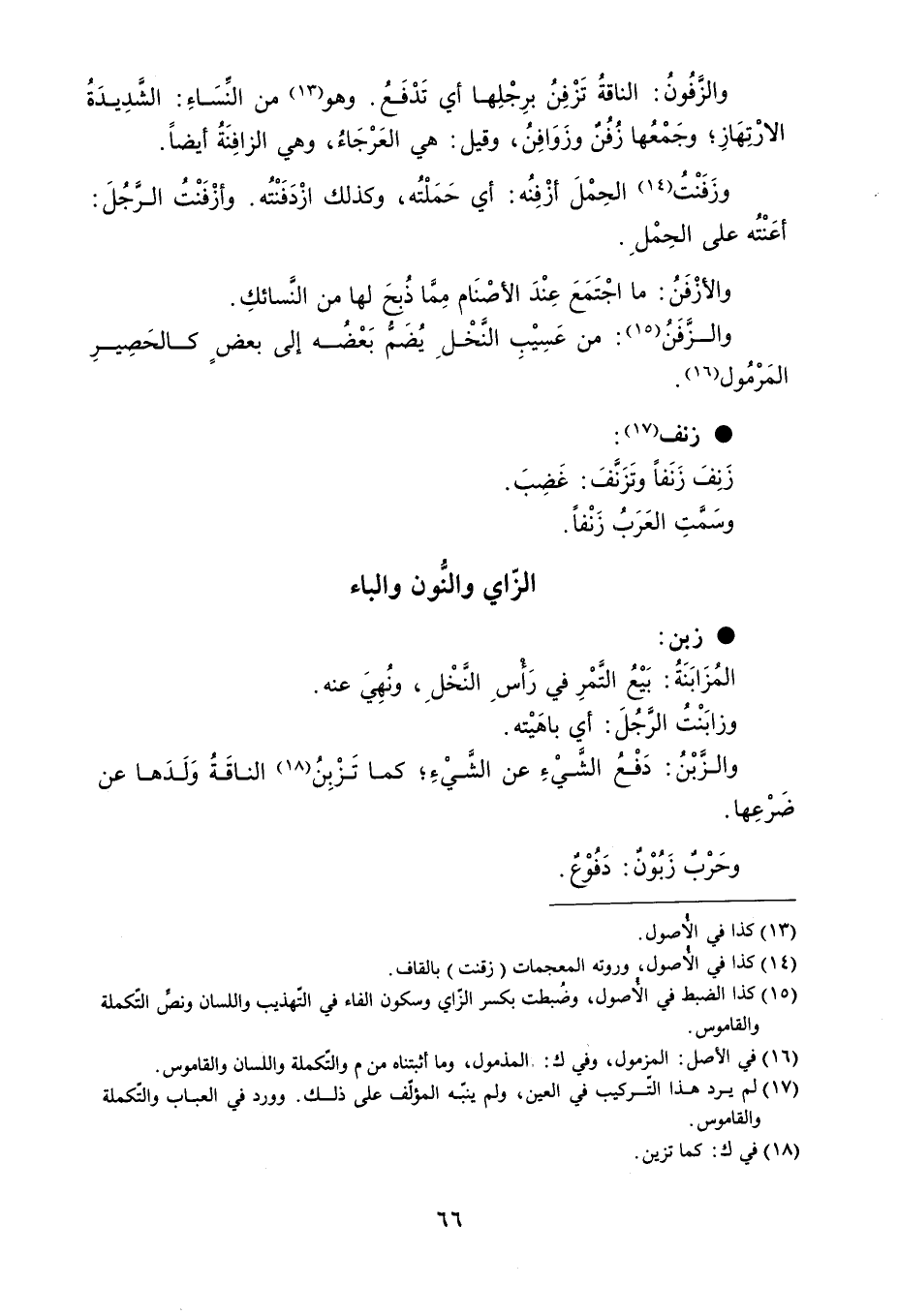 والزَفُونُ : الناقةُ تَزْفِنُ برِجْلِها أي تَدْفَعُ . وهو من النِّسَاءِ : الشَّدِيدَةُ الارْتِهَازِ وجَمْعُها زُفُنٌ وزَوَافِنُ ، وقيل : هي العَرْجَاءُ ، وهي الزافِنَةُ أيضاً . وزَفَنْتُ الحِمْلَ أزْفِنُه : أي حَمَلْتُه ، وكذلك ازْدَفَنْتُه . وأزْفَنْتُ الرَّجُلَ : أعَنْتُه على الحِمْلِ . والأزْفَنُ : ما اجْتَمَعَ عِنْدَ الأصْنَام مِمَّا ذبحَ لها من النَّسائكِ . والزَّفَنُ : من عَسِيْب النَّخْلِ يُضَمُّ بَعْضُه إلى بعض كالحَصِيرِ المَرْمُول . زنف زَنِفَ زَنَفاً وتَزَنَّفَ غَضِبَ . وسَمَّتِ العَرَبُ زَنْفاً .