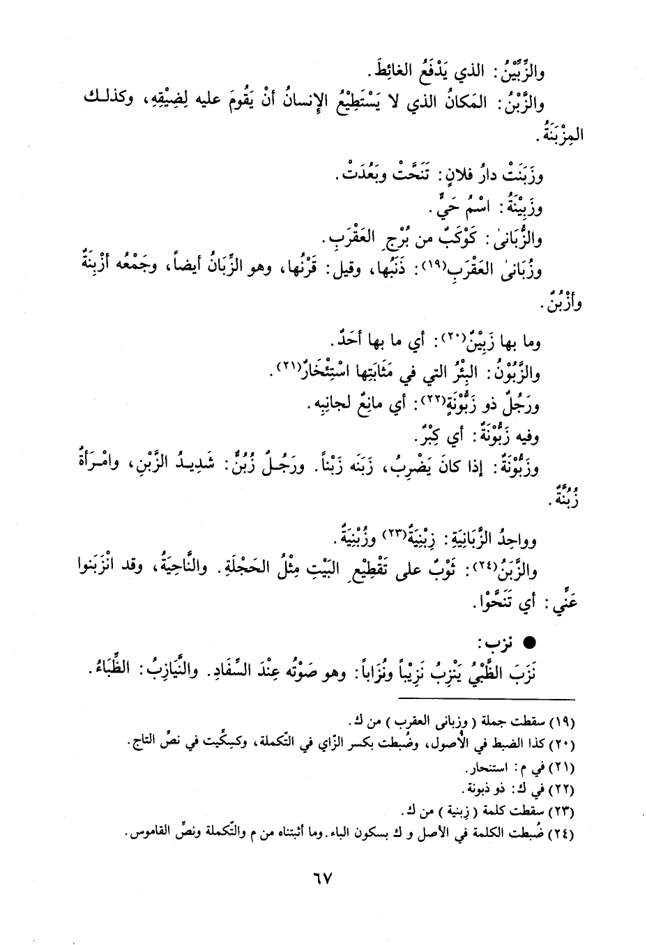 والزِّبَيْنُ : الذي يَدْفَعُ الغائِطَ . والزَبْنُ : المَكانُ الذي لا يَسْتَطِيْعُ الإنسانُ أنْ يَقُومَ عليه لِضِيْقِهِ ، وكذلك المِزْبَنَةُ . وزَبَنَتْ دارُ فلانٍ : تَنَحَّتْ وبَعُدَتْ . وزَبِيْنَةُ : اسْمُ حَيٍّ . والزُبَانى : كَوْكَبٌ من بُرْجِ العَقْرَبِ . وزُبَانى العَقْرَبِ : ذَنَبُها ، وقيل : قَرْنُها ، وهو الزِّبَانُ أيضاً ، وجَمْعُه أزْبِنَةٌ وأزْبُنٌ . وما بها زَبِيْنٌ : أي ما بها أحَدٌ . والزَّبُوْنُ : البئْرُ التي في مَثَابَتِها اسْتِئْخَاز . ورَجُلٌ ذو زَبُّوْنَةٍ : أي مانِعٌ لجانِبِه . وفيه زَبوْنَة : أي كِبْر . وزَبُّوْنَةٌ : إذا كانَ يَضرِبُ ، زَبَنَه زَبْناً . ورَجُلٌ زُبُن : شَدِيدُ الزَّبْنِ ، وامْرَأةٌ زبنة . وواحِدُ الزَبَانِيَةِ : زِبْنِيَةٌ وزُبْنِيَةٌ . والزبَنُ : ثَوْبٌ على تَقْطِيْعِ البَيْتِ مِثْلُ الحَجْلَةِ . عَني : أي تَنَحَّوْا . والناحِيَةُ ، وقد انْزَبَنوا عني : أي تنحوا . نزب نَزَبَ الظبْيُ يَنْزِبُ نَزِيْباً ونُزَاباً : وهو صَوْتُه عِنْدَ السِّفَادِ . والنَّيَازِبُ : الظبَاءُ .