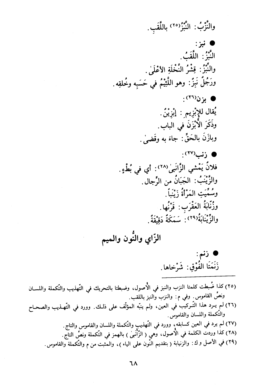 والنَزْبُ : النَّبْزُ باللَقَبِ . نبز النَبْزُ : اللَّقَبُ . والنِّبْزُ : قِشْرُ النَّخْلَةِ الأعْلَى . ورَجُلٌ نَبِزٌ : وهو اللَئِيْمُ في حَسَبِه وخُلقِه . بزن يُقال للإبْزِيمَ إبْزِيْنٌ . وذَكَرَ الأبْزَنَ في الباب . وبازَنَ بالحَق : جاءَ به وقَضى . زنب : فلانُ يَمْشي الزَّانَبى : أي في بُطْءٍ . والزَيْنَبُ : الجَبَانُ من الرِّجال . وسُمَيَتِ المَرْأةُ زَيْنَباً وزُنّابَةُ العَقْرَبِ : قَرْنُها . والزيْنَابَةُ : سَمَكَةٌ دَقِيْقَةٌ .