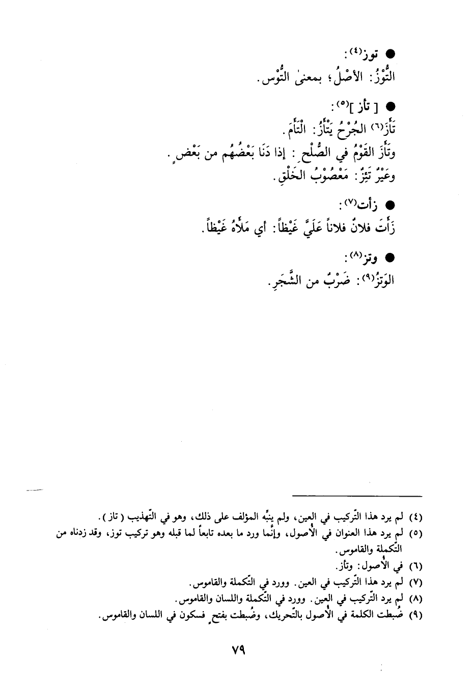 توز التُّوْزُ : الأصْلُ ؛ بمعنى التُّوْس . تأز تَأزَ الجُرْحُ يَتْأزُ : الْتَأمَ . وتَأزَ القَوْمُ في الصُّلْحِ : إذا دَنَا بَعْضُهُم من بَعْضٍ . وعَيْرٌ تَئِزٌ : مَعْصُوْبُ الخَلْقِ . زأت زَأتَ فلانٌ فلاناً عَلَي غَيْظاً : أي مَلأهُ غَيْظاً . وتز الوَتزُ : ضَرْبٌ من الشَّجَرِ .