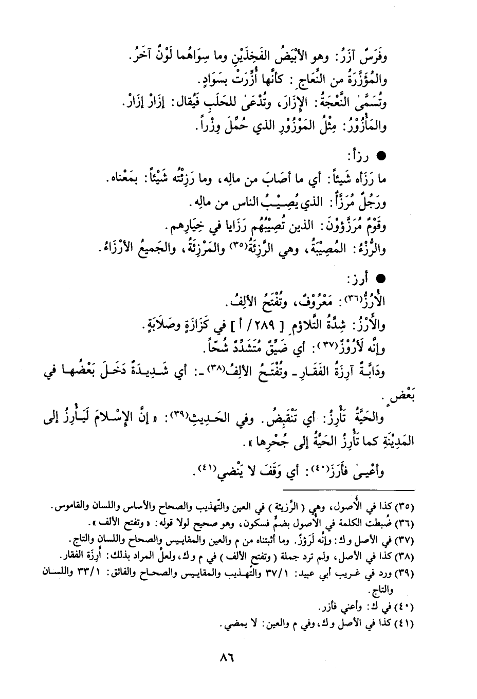 وفَرَسٌ آزَرُ : وهو الأبْيَضُ الفَخِذَيْنِ وما سِوَاهُما لَوْنٌ آخَرُ . والمُؤَزَرَة من النعَاجِ : كأنها أزِّرَت بسَوَادٍ . وتُسَقَى النَّعْجَةُ : الإِزَارَ ، وتُدْعَى للحَلَبِ فَيُقال : إزَارْ إزَارْ . والمَأزُوْرُ : مِثْلُ المَوْزُوْرِ الذي حُمَلَ وِزْراً . رزأ ما رَزَأه شَيئاً : أي ما أصَابَ من مالِه ، وما رَزِئْتُه شَيْئاً : بمَعْناه . ورَجُلٌ مُرَزَأٌ : الذي يُصِيْبُ الناس من مالِه . وقَوْمٌ مُرَزؤوْنَ : الذين تُصِيْبُهمُ رَزَايا في خِيَارِهم . والرُّزْءُ : المُصِيْبَةُ ، وهي الرزِئَة والمَرْزِئَةُ ، والجَميعُ الأرْزَاءُ . أرز الأرُز : مَعْرُوْف ، وُتفْتَحُ الألِفُ . والأرْزُ : شِدةُ التَلاؤم في كَزَازَةٍ وصَلابَةٍ . وأنَه لأرُوْزٌ : أيَ ضَيقٌ مُتَشَددٌ شُحّاً . ودَابةٌ آرِزَةُ الفَقَارِ - وتُفْتَحُ الألِفُ - : أي شَدِيدَةٌ دَخَلَ بعضُها في بَعْض والحَيَّةُ تَأرِزُ : أي تَنْقَبِضُ . وفي الحَدِيثِ : ' إن الإِسْلامَ لَيَأرِزُ إلى المَدِيْنَةِ كما تَأرِزُ الحَيةُ إلى جُحْرِها ' . وأعْيى فأرَزَ : أي وَقَفَ لا يَنْضي .