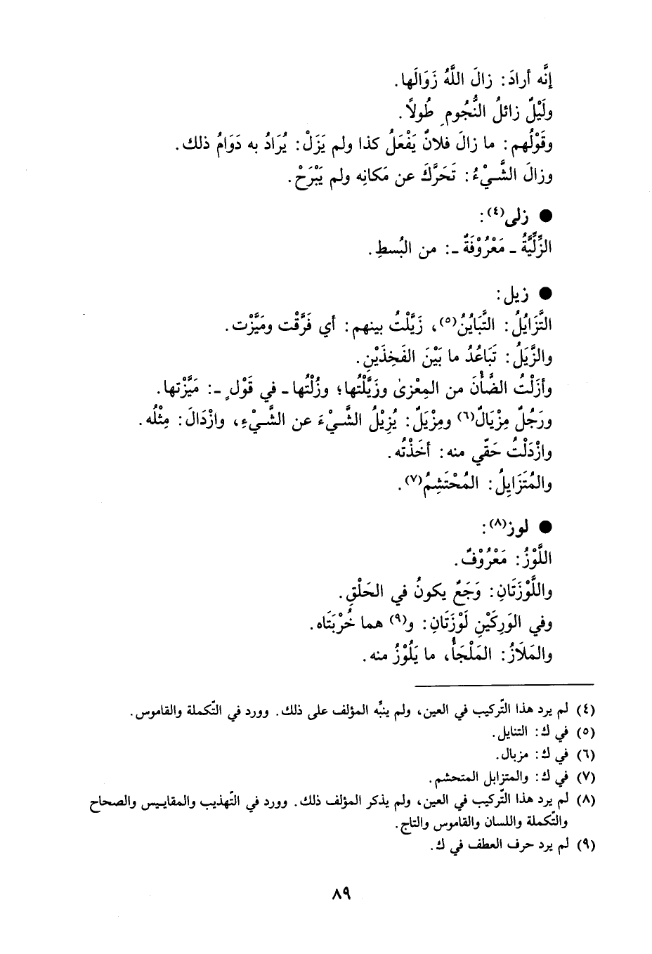 إنَّه أرادَ : زالَ اللَهُ زَوَالَها . ولَيْلٌ زائلُ النُجُومِ طُولاً . وقَوْلُهم : ما زالَ فلانٌ يَفْعَلُ كذا ولم يَزَلْ : يُرَادُ به دَوَامُ ذلك . وزالَ الشًيْءُ : تَحَرَّكَ عن مَكانِه ولم يَبْرَحْ . زلى الزَليةُ - مَعْرُوْفَةٌ - : من البُسطِ . زيل التزَايُلُ : التَبَايُنُ ، زَيَّلْتُ بينهم : أي فَرَّقْت ومَيَّزْت . والزَيَلُ : تَبَاعُدُ ما بَيْنَ الفَخِذَيْنِ . وأزَلْتُ الضأنَ من المِعْزى وزَيلْتُها ؛ وزُلْتُها - في قَوْلٍ - : مَيزْتها . ورَجُل مِزْيَالٌ ومِزْيَلٌ : يُزِيْلُ الشَّيْءَ عن الشيْءِ ، وازْدَالَ : مِثْلُه . وازْدَلْتُ حَقي منه : أخَذْتُه . والمُتَزَايِلُ : المُحْتَشِمُ . لوز اللَّوْزُ : مَعْرُوْفٌ . واللَّوْزَتَانِ : وَجَعٌ يكونُ في الحَلْقِ . وفي الوَرِكَيْنِ لَوْزَتَانِ : وهما خرْبَتَاه . والمَلاَزُ : المَلْجَأ ، ما يَلُوْزُ منه .