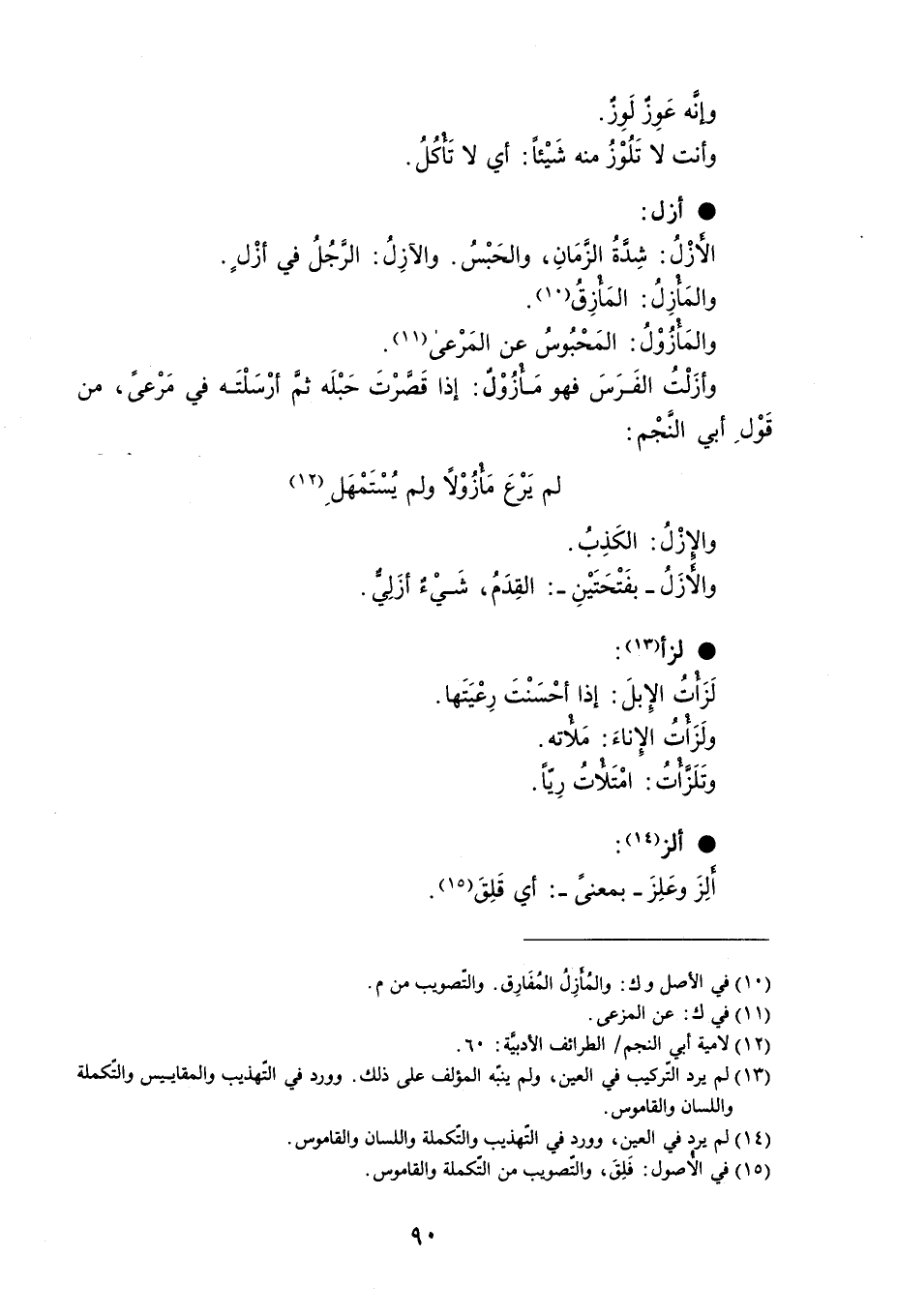 وأنَه عَوِزُ لَوِزٌ . وأنت لا تَلُوْزُ منه شَيْئاً : أي لا تَأكُلُ . أزل الأزْلُ : شِدَةُ الزَّمَانِ ، والحَبْسُ . والأزل : الرَّجُلُ في أزْلٍ . والمَأزِلُ : المَأزِق . والمَأزُوْلُ : المَحْبُوسُ عن المَرْعى . وأزَلْتُ الفَرَسَ فهو مَأزُوْلٌ : إذا قَصَّرْتَ حَبْلَه ثمَّ أرْسَلْتَه في مَرْعى ، من أبي النَجْم : لم يَرْعَ مَأزُوْلاً ولم يُسْتَمْهَلَ والإزْلُ : الكَذِبُ . والأزَلُ - بفَتْحَتَيْنِ - : القِدَمُ ، شَيْءٌ أزَلِي . لزأ لَزأتُ الإبلَ : إذا أحْسَنْتَ رِعْيَتَها . ولَزأتُ الإِناءَ : مَلأته . وتَلَزأتُ : امْتَلأتُ رِيّاً . ألز ألِزَ وعَلِزَ - بمعنىً - : أي قَلِقَ