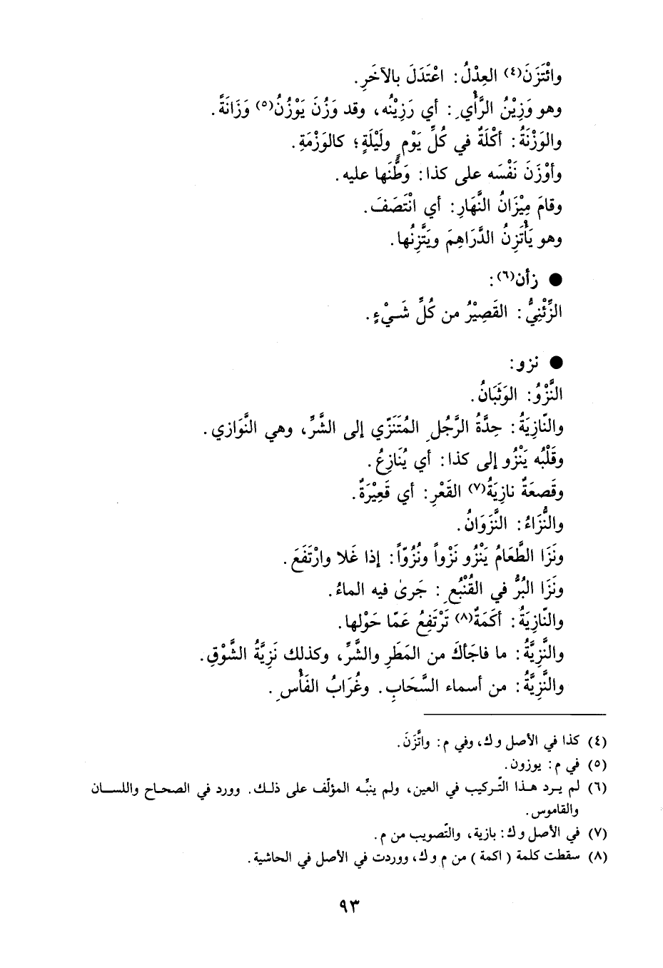 وائْتَزَنَ العِدْلُ : اعْتَدَلَ بالآخر . وهو وَزِيْنُ الرأيِ : أي رَزِيْنُه ، وقد وَزُنَ يَوْزُنُ وَزَانَةً . والوَزْنَةُ : أكْلَةٌ في كل يَوْمِ ولَيْلَةٍ ؛ كالوَزْمَةِ . وأوْزَنَ نَفْسَه على كذا : وَطّنَها عليه . وقامَ مِيْزَانُ النَّهَارِ : أي انْتَصَفَ . وهو يَأتَزِنُ الدَّرَاهِمَ وَيتَّزِنُها . زأن الزئْنِيُّ : القَصِيْرُمن كُلِّ شَيْءٍ . نزو النَزْوُ : الوَثَبَانُ . والنّازِيَةُ : حِدَةُ الرَّجُلِ المُتَنَزّي إلى الشَّرِّ ، وهي النَّوَازي . وقَلْبُه يَنْزُو إلى كذا : أي يُنَازعُ . وقَصعَةٌ نازِيَة القَعْرِ : أي قَعِيْرَةٌ . والنُّزَاءُ : النزَوَانُ . وَنزَا الطعَامُ يَنزُو نَزْواً وُلزُوّاً : إذا غَلا وارْتَفَعَ . وَلزَا البُرُ في القُنْبُعِ : جَرى فيه الماءُ . والنّازِيَةُ : أكَمَة تَرْتَفِعُ عَمّا حَوْلها . والنَّزِيةُ : ما فاجَأكَ من المَطَرِ والشَّر ، وكذلك نَزِيَّةُ الشَّوْقِ . والنَزِيةُ : من أسماء السَّحَابِ . وغُرَابُ الفَأسِ .