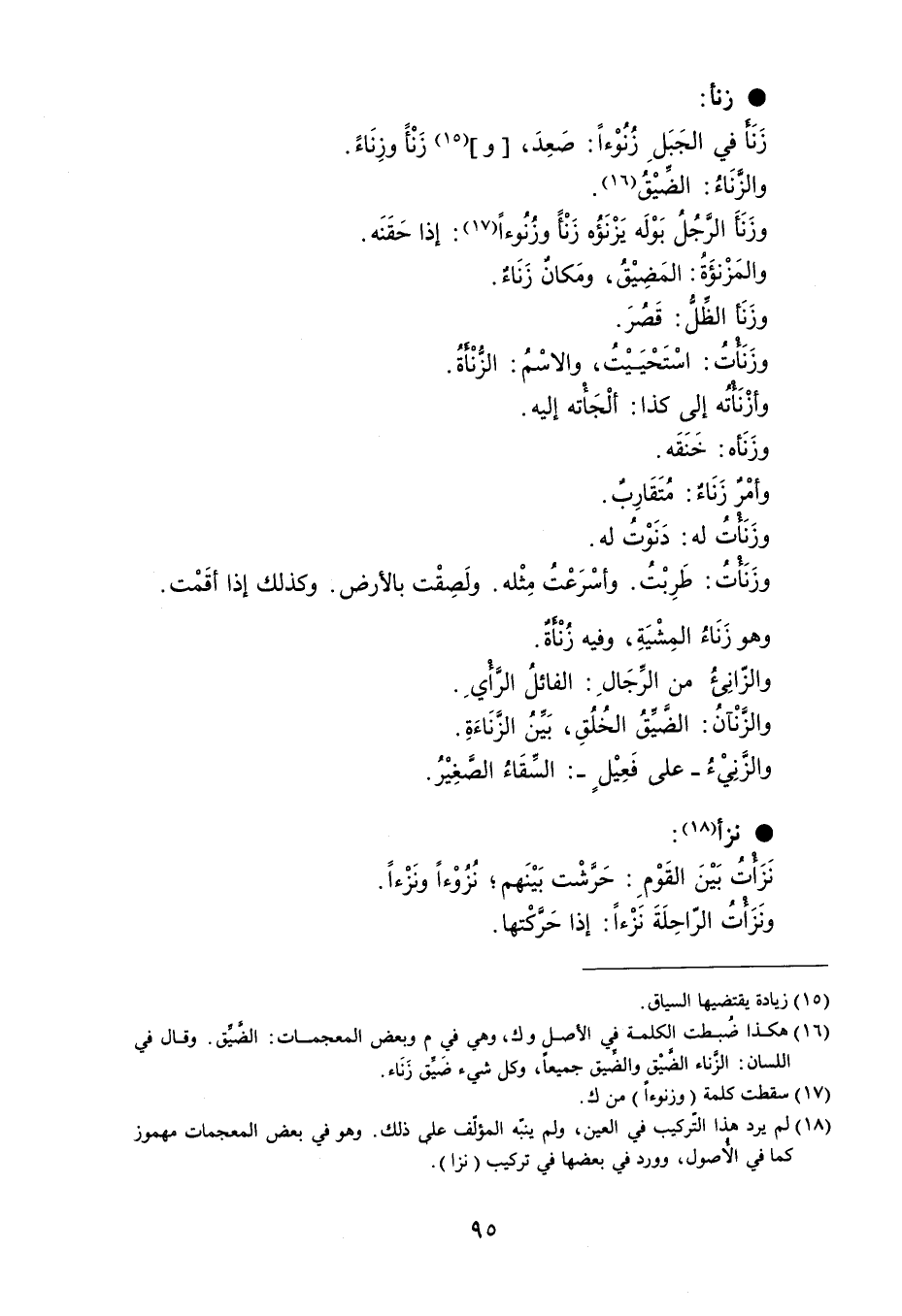 زنأ زَنَاء في الجَبَلِ زُنُوْءأ : صَعِدَ ، و زَنْأ وزِنَاءً . والزَنَاءُ : الضيْقُ . وزَنَأَ الرجُلُ بَوْلَه يَزْنَؤُه زَنْأً وزُنُوءاً : إذا حَقَنَه . والمَزْنؤَةُ : المَضِيْقُ ، ومَكانٌ زَنَاءٌ . وزَنَأ الظِّلُ : قَصُرَ . وزَنَاءتُ : اسْتَحْيَيْتُ ، والاسْمُ : الزُّنْأةُ . وأزْنَأتُه إلىِ كذا : ألْجَأته إليه . وزَنَأه : خَنقَه . وأمْرٌ زَنَاء : مُتَقَارِبٌ . وزَنَأتُ له : دَنَبْرتُ له . وزَنَأتُ : طَرِبْت . وأسْرَعْتُ مِثْله . ولَصِقْت بالأرض وكذلك إذا أقمت . وهو زَنَاءُ المِشْيَةِ ، وفيه زُنْأةٌ . والزانِئُ من الرِّجَالِ : الفائلُ الرأيِ . والزَّنْآنُ : الضَّيِّقُ الخُلُقِ ، بَيِّنُ الزَّنَاءَةِ . والزَّنِيْءُ - على فَعِيْلٍ - : السقَاءُ الصَغِيْرُ . نزأ نَزَأتُ بَيْنَ القَوْمِ : حَرَّشْت بَيْنَهم ؛ نُزُوْءاً ونَزْءاً . ونَزأتُ الراحِلَةَ نَزْءاً : إذا حَركْتها .