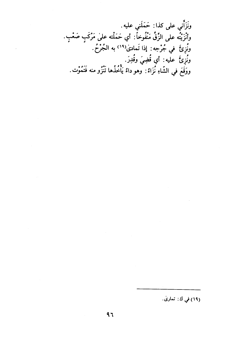ونَزأني على كذا : حَمَلَني عليه . وأنْزَيْتُه على الزَقِّ مَنْفُوخاً : أي حَمَلْته على مَرْكَبٍ صعبٍ . ونُزِئَ في جُرْحِه : إذا تَمادى به الجُرْحُ . ونزِئَ عليه : أي قُضِيَ وقُدِرَ . ووَقَعَ في الشّاءِ نُزَاءٌ : وهوداءٌ يَأخُذُها تَنْزُو منه فَتَمُوْت .