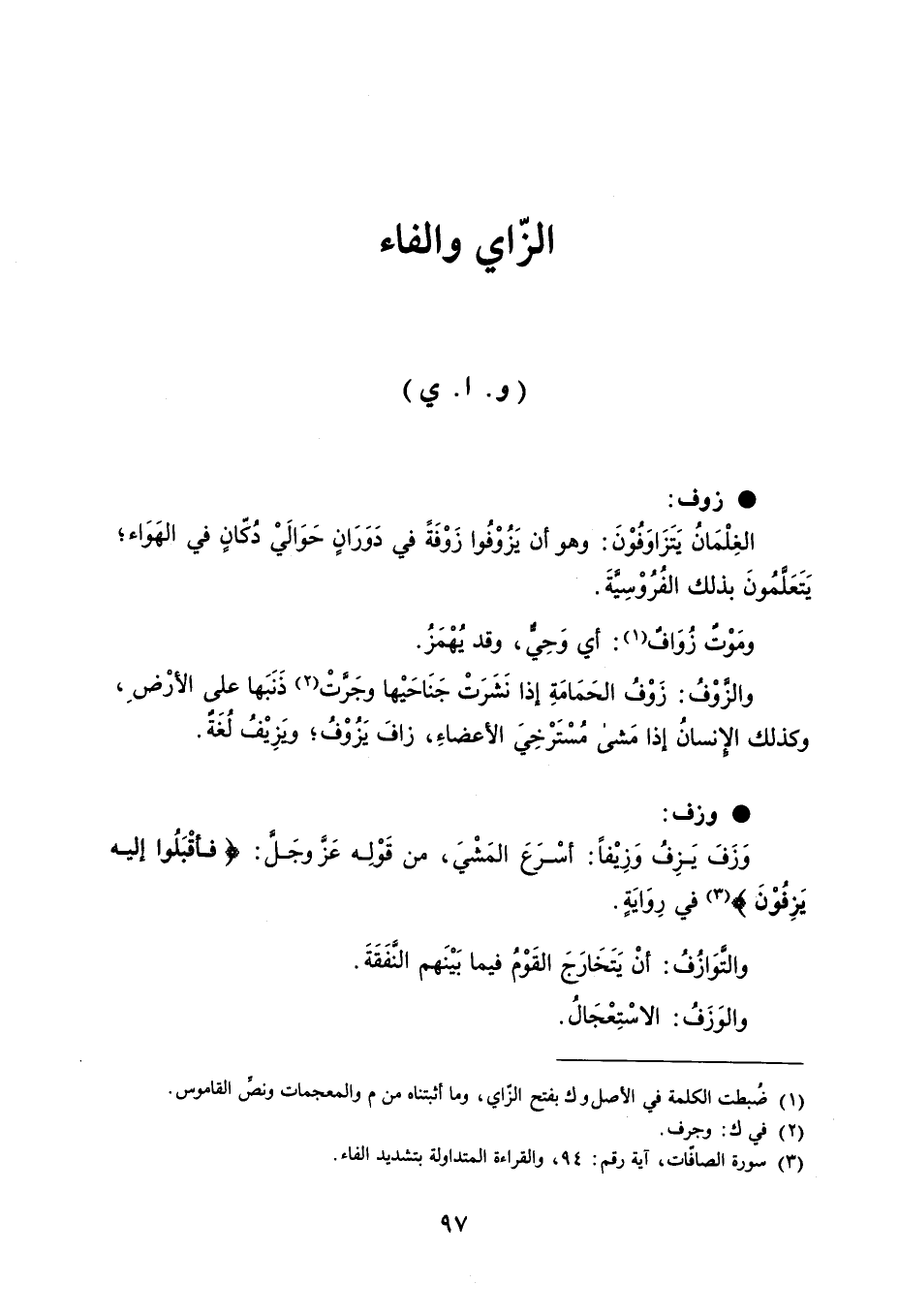 زوف الغِلْمَانُ يَتَزَاوَفُوْنَ : وهو أن يَزُوْفُوا زَوْفَةً في دَوَرَانٍ حَوَالَيْ دُكّانٍ في الهَوَاء ؛ يَتَعَلمُونَ بذلك الفُرُوْسِيَّةَ . ومَوْتٌ زُوَاف : أي وَحِي ، وقد يُهْمَزُ . والزوْفُ : زَوْفُ الحَمَامَةِ إذا نَشَرَتْ جَنَاحَيْها وجَرتْ ذَنَبَها على الأرْضِ ، وكذلك الإنسانُ إذا مَشى مُسْتَرْخِيَ الأعضاءِ ، زافَ يَزُوْفُ ؛ وَيزِيْفُ لُغَة . وزف وَزَفَ يَزِفُ وَزِيْفاً : أسْرَعَ المَشْيَ ، من قَوْله عَزَّ وجَلَّ : ' فاقْبَلُوا إليه يَزِفُوْنَ ' في رِوَايَةٍ . والتوَازُفُ : أنْ يَتَخَارَجَ القَوْمُ فيما بَيْنَهم النَّفَقَة . والوَزَفُ : الاسْتِعْجَالُ .