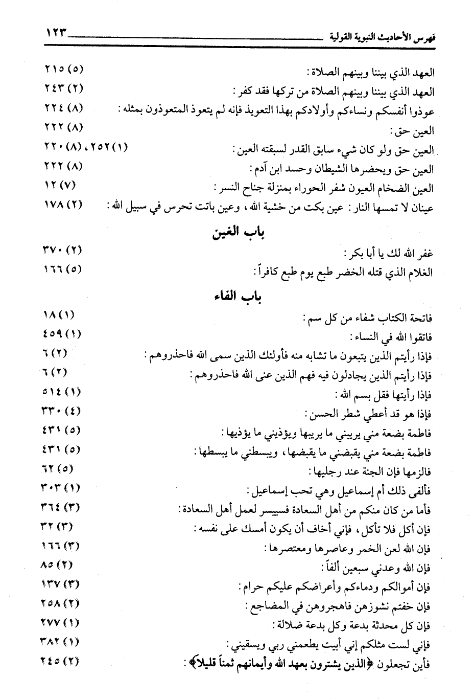 فاتحة الكتاب شفاء من كل سم: (1) 18 فاتقوا الله في النساء: (1) 459 فإذا رَأَيْتُمُ الَّذِينَ يَتَّبِعُونَ مَا تَشَابَهَ مِنْهُ فَأُولَئِكَ الذين سمى الله فاحذروهم: (2) 6 فَإِذَا رَأَيْتُمُ الَّذِينَ يُجَادِلُونَ فِيهِ فَهُمُ الَّذِينَ عنى الله فاحذروهم: (2) 6 فإذا رأيتها فقل بسم الله: (1) 514 فإذا هو قد أعطي شطر الحسن: (4) 330 فاطمة بضعة مني يريبني ما يريبها ويؤذيني ما يؤذيها: (5) 431 فَاطِمَةُ بَضْعَةٌ مِنِّي يَقْبِضُنِي مَا يَقْبِضُهَا، ويَبْسُطُنِي ما يبسطها: (5) 431 فألزمها فإن الجنة عند رجليها: (5) 62 فألفى ذلك أم إسماعيل وهي تحب إسماعيل: (1) 303 فَأَمَّا مَنْ كَانَ مِنْكُمْ مِنْ أَهْلِ السَّعَادَةِ فسييسر لعمل أهل السعادة: (3) 364 فَإِنْ أَكَلَ فَلَا تَأْكُلْ، فَإِنِّي أَخَافُ أَنْ يكون أمسك على نفسه: (3) 32 فإن الله لعن الخمر وعاصرها ومعتصرها: (3) 166 فإن الله وعدني سبعين ألفا: (2) 85 فإن أموالكم ودماءكم وأعراضكم عليكم حرام: (3) 137 فإن خفتم نشوزهن فاهجروهن في المضاجع: (2) 258 فَإِنَّ كُلَّ مُحْدَثَةٍ بِدْعَةٌ وَكُلَّ بِدْعَةٍ ضَلَالَةٌ: (1) 277 فَإِنِّي لَسْتُ مِثْلَكُمْ إِنِّي أَبِيتُ يُطْعِمُنِي رَبِّي ويسقيني: (1) 382 فَأَيْنَ تَجْعَلُونَ الَّذِينَ يَشْتَرُونَ بِعَهْدِ اللَّهِ وَأَيْمانِهِمْ ثَمَناً قَلِيلًا: (2) 245