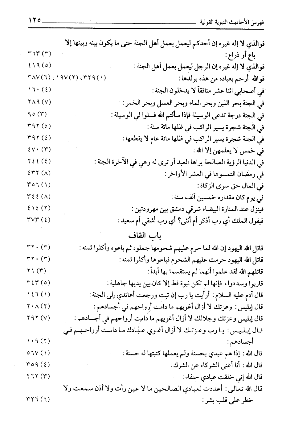 قَاتَلَ اللَّهُ الْيَهُودَ إِنَّ اللَّهَ لَمَّا حَرَّمَ عَلَيْهِمْ شُحُومَهَا جَمَّلُوهُ ثُمَّ بَاعُوهُ وَأَكَلُوا ثَمَنَهُ: (3) 320 قَاتَلَ اللَّهُ الْيَهُودَ حُرِّمَتْ عَلَيْهِمُ الشُّحُومُ فَبَاعُوهَا وأكلوا ثمنه: (3) 320 قَاتَلَهُمُ اللَّهُ لَقَدْ عَلِمُوا أَنَّهُمَا لَمْ يَسْتَقْسِمَا بها أبدا: (3) 21 قَارِبُوا وَسَدِّدُوا، فَإِنَّهَا لَمْ تَكُنْ نُبُوَّةٌ قَطُّ إلا كان بين يديها جاهلية: (5) 343 قَالَ آدَمُ عَلَيْهِ السَّلَامُ: أَرَأَيْتَ يَا رَبِّ إِنْ تُبْتُ وَرَجَعْتُ أَعَائِدِي إِلَى الْجَنَّةِ: (1) 146 قَالَ إِبْلِيسُ: وَعِزَّتِكَ لَا أَزَالُ أُغْوِيهِمْ مَا دَامَتْ أَرْوَاحُهُمْ فِي أجسادهم: (2) 208 قَالَ إِبْلِيسُ وَعِزَّتِكَ وَجَلَالِكَ لَا أَزَالُ أُغْوِيهِمْ مَا دَامَتْ أَرْوَاحُهُمْ فِي أجسادهم: (7) 292 قَالَ إِبْلِيسُ: يَا رَبِّ وَعِزَّتِكَ لَا أَزَالُ أُغْوِي عِبَادَكَ مَا دَامَتْ أَرْوَاحُهُمْ فِي أَجْسَادِهِمْ: (2) 109 قَالَ اللَّهُ: إِذَا هَمَّ عَبْدِي بِحَسَنَةٍ وَلَمْ يعملها كتبتها له حسنة: (1) 567 قَالَ اللَّهُ: أَنَا أَغْنَى الشُّرَكَاءِ عَنِ الشِّرْكِ: (4) 359 قال الله إني خلقت عبادي حنفاء: (3) 262 قَالَ اللَّهُ تَعَالَى: أَعْدَدْتُ لِعِبَادِي الصَّالِحِينَ مَا لَا عَيْنٌ رَأَتْ وَلَا أُذُنٌ سَمِعَتْ وَلَا خَطَرَ عَلَى قَلْبِ بَشَرٍ: (6) 326