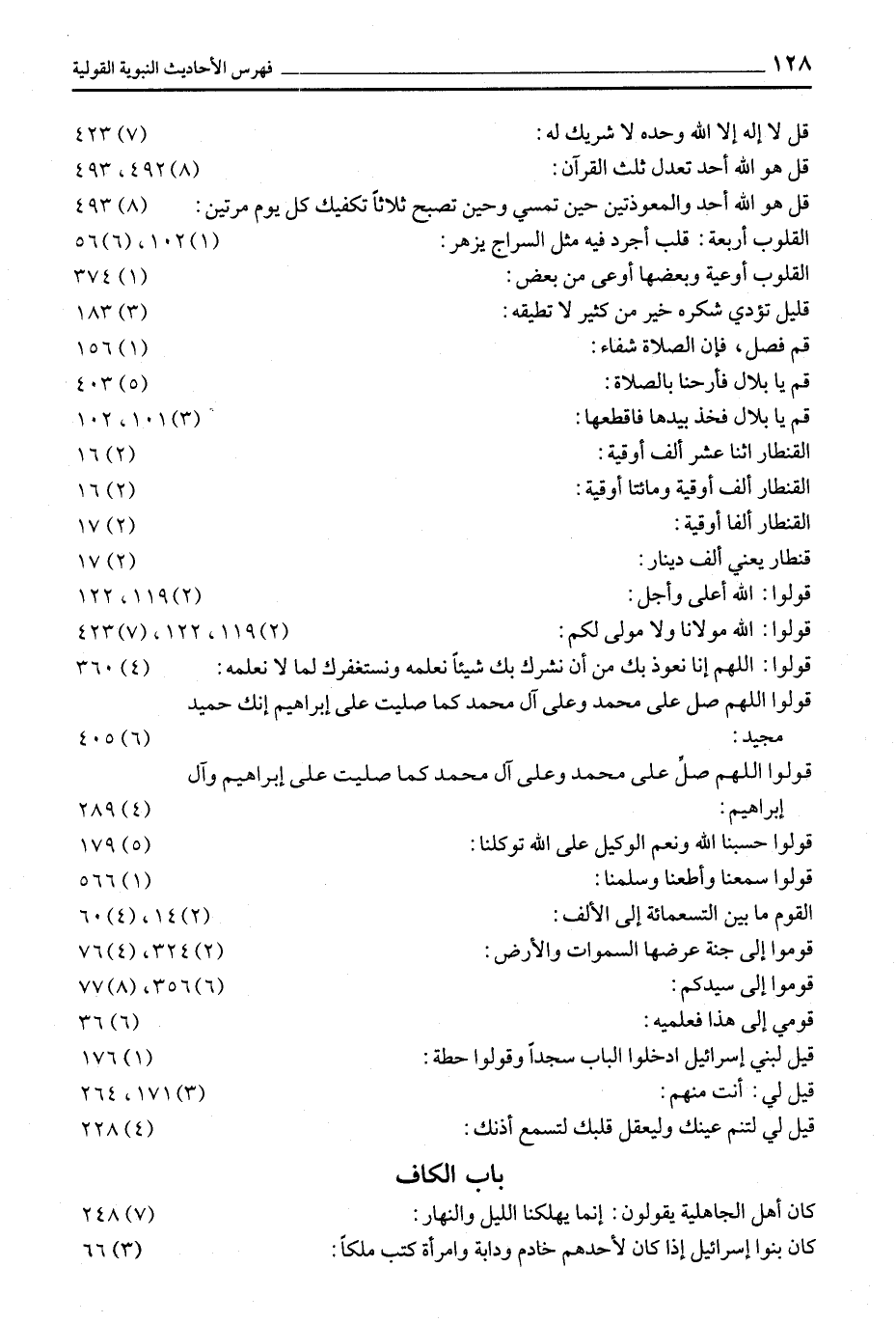 قُلْ لَا إِلَهَ إِلَّا اللَّهُ وَحْدَهُ لَا شَرِيكَ له: (7) 423 قل هو الله أحد تعدل ثلث القرآن: (8) 492، 493 قُلْ هُوَ اللَّهُ أَحَدٌ وَالْمُعَوِّذَتَيْنِ حِينَ تُمْسِي وحين تصبح ثلاثا تكفيك كل يوم مرتين: (8) 493 الْقُلُوبُ أَرْبَعَةٌ: قَلْبٌ أَجْرَدُ فِيهِ مِثْلُ السِّرَاجِ يزهر: (1) 102، (6) 56 القلوب أوعية وبعضها أوعى من بعض: (1) 374 قَلِيلٌ تُؤَدِّي شُكْرَهُ خَيْرٌ مِنْ كَثِيرٍ لَا تطيقه: (3) 183 قم فصل، فإن الصلاة شفاء: (1) 156 قم يا بلال فأرحنا بالصلاة: (5) 403 قم يا بلال فخذ بيدها فاقطعها: (3) 101، 102 القنطار اثنا عشر ألف أوقية: (2) 16 القنطار ألف أوقية ومائتا أوقية: (2) 16 القنطار ألفا أوقية: (2) 17 قنطار يعني ألف دينار: (2) 17 قولوا: الله أعلى وأجل: (2) 119، 122 قولوا: الله مولانا ولا مولى لكم: (2) 119، 122، (7) 423 قُولُوا: اللَّهُمَّ إِنَّا نُعُوذُ بِكَ مِنْ أَنْ نُشْرِكَ بِكَ شَيْئًا نَعْلَمُهُ وَنَسْتَغْفِرُكَ لِمَا لَا نعلمه: (4) 360 قُولُوا اللَّهُمَّ صِلِّ عَلَى مُحَمَّدٍ وَعَلَى آلِ محمد كما صليت على إبراهيم إنك حميد مجيد: (6) 405 قُولُوا اللَّهُمَّ صِلِّ عَلَى مُحَمَّدٍ وَعَلَى آلِ مُحَمَّدٍ كَمَا صَلَّيْتَ عَلَى إِبْرَاهِيمَ وَآلِ إِبْرَاهِيمَ: (4) 289 قُولُوا حَسْبُنَا اللَّهُ وَنِعْمَ الْوَكِيلُ عَلَى اللَّهِ توكلنا: (5) 179 قولوا سمعنا وأطعنا وسلمنا: (1) 566 القوم ما بين التسعمائة إلى الألف: (2) 14، (4) 60 قوموا إلى جنة عرضها السموات والأرض: (2) 324، (4) 76 قوموا إلى سيدكم: (6) 356، (8) 77 قومي إلى هذا فعلميه: (6) 36 قِيلَ لِبَنِي إِسْرَائِيلَ ادْخُلُوا الْبَابَ سُجَّدًا وَقُولُوا حطة: (1) 176 قيل لي: أنت منهم: (3) 171، 264 قيل لي لتنم عينك وليعقل قلبك لتسمع أذنك: (4) 228
