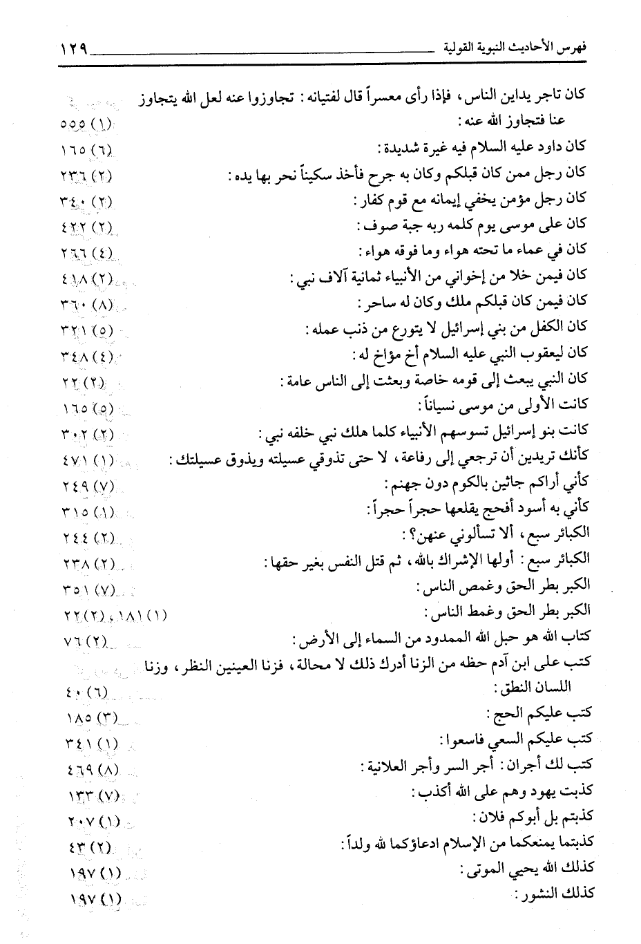كَانَ تَاجِرٌ يُدَايِنُ النَّاسَ، فَإِذَا رَأَى مُعْسِرًا قَالَ لِفِتْيَانِهِ: تَجَاوَزُوا عَنْهُ لَعَلَّ اللَّهَ يَتَجَاوَزُ عنا فتجاوز الله عنه: (1) 555 كَانَ دَاوُدُ عَلَيْهِ السَّلَامُ فِيهِ غَيْرَةٌ شَدِيدَةٌ: (6) 165 كَانَ رَجُلٌ مِمَّنْ كَانَ قَبْلَكُمْ وَكَانَ بِهِ جرح فأخذ سكينا نحر بها يده: (2) 236 كَانَ رَجُلٌ مُؤْمِنٌ يُخْفِي إِيمَانَهُ مَعَ قَوْمٍ كفار: (2) 340 كَانَ عَلَى مُوسَى يَوْمَ كَلَّمَهُ رَبُّهُ جُبَّةُ صوف: (2) 422 كَانَ فِي عَمَاءٍ مَا تَحْتَهُ هَوَاءٌ وَمَا فوقه هواء: (4) 266 كَانَ فِيمَنْ خَلَا مِنْ إِخْوَانِي مِنَ الْأَنْبِيَاءِ ثمانية آلاف نبي: (2) 418 كان فيمن كان قبلكم ملك وكان له ساحر: (8) 360 كَانَ الْكِفْلُ مِنْ بَنِي إِسْرَائِيلَ لَا يَتَوَرَّعُ من ذنب عمله: (5) 321 كَانَ لِيَعْقُوبَ النَّبِيِّ عَلَيْهِ السَّلَامُ أَخٌ مُؤَاخٍ له: (4) 348 كَانَ النَّبِيُّ يُبْعَثُ إِلَى قَوْمِهِ خَاصَّةً وَبُعِثْتُ إلى الناس عامة: (2) 22 كانت الأولى من موسى نسيانا: (5) 165 كَانَتْ بَنُو إِسْرَائِيلَ تَسُوسُهُمُ الْأَنْبِيَاءُ كُلَّمَا هَلَكَ نبي خلفه نبي: (2) 302 كَأَنَّكِ تُرِيدِينَ أَنْ تَرْجِعِي إِلَى رِفَاعَةَ، لَا حتى تذوقي عسيلته ويذوق عسيلتك: (1) 471 كأني أراكم جاثين بالكوم دون جهنم: (7) 249 كَأَنِّي بِهِ أَسْوَدَ أَفْحَجَ يَقْلَعُهَا حَجَرًا حَجَرًا: (1) 315 الكبائر سبع، ألا تسألوني عنهن؟: (2) 244 الْكَبَائِرُ سَبْعٌ: أَوَّلُهَا الْإِشْرَاكُ بِاللَّهِ، ثُمَّ قَتْلُ النفس بغير حقها: (2) 238 الكبر بطر الحق وغمص الناس: (7) 351 الكبر بطر الحق وغمط الناس: (1) 181، (2) 22 كِتَابُ اللَّهِ هُوَ حَبْلُ اللَّهِ الْمَمْدُودُ مِنَ السماء إلى الأرض: (2) 76 كَتَبَ عَلَى ابْنِ آدَمَ حَظَّهُ مِنَ الزِّنَا أدرك ذلك لا محالة، فزنا العينين النظر، وزنا اللسان النطق: (6) 40 كتب عليكم الحج: (3) 185 كتب عليكم السعي فاسعوا: (1) 341 كُتِبَ لَكَ أَجْرَانِ: أَجْرُ السِّرِّ وَأَجْرُ الْعَلَانِيَةِ: (8) 469 كذبت يهود وهم على الله أكذب: (7) 133 كذبتم بل أبوكم فلان: (1) 207 كذبتما يمنعكما من الإسلام ادعاؤكما لله ولدا: (2) 43 كذلك الله يحيي الموتى: (1) 197 كذلك النشور: (1) 197