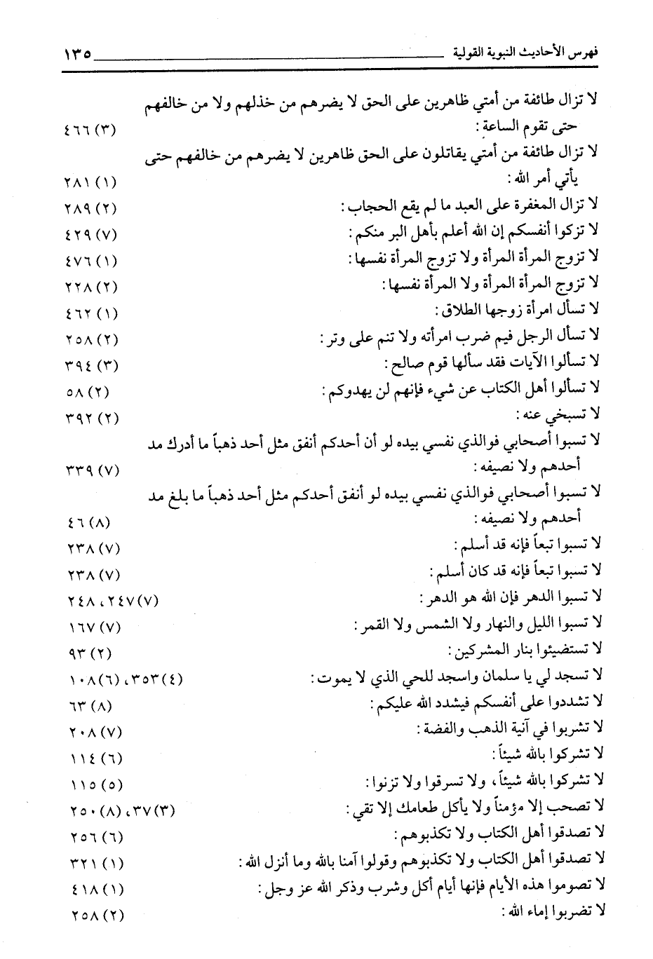 لَا تَزَالُ طَائِفَةٌ مِنْ أُمَّتِي ظَاهِرِينَ عَلَى الْحَقِّ لَا يَضُرُّهُمْ مَنْ خَذَلَهُمْ وَلَا مَنْ خالفهم حتى تقوم الساعة: (3) 466 لا تزال طائفة من أمتي يقاتلون عَلَى الْحَقِّ ظَاهِرِينَ لَا يَضُرُّهُمْ مَنْ خَالَفَهُمْ حتى يأتي أمر الله: (1) 281 لَا تَزَالُ الْمَغْفِرَةُ عَلَى الْعَبْدِ مَا لَمْ يقع الحجاب: (2) 289 لَا تُزَكُّوا أَنْفُسَكُمْ إِنَّ اللَّهَ أَعْلَمُ بِأَهْلِ البر منكم: (7) 429 لَا تُزَوِّجُ الْمَرْأَةُ الْمَرْأَةَ وَلَا تُزَوِّجُ الْمَرْأَةُ نفسها: (1) 476 لَا تُزَوِّجُ الْمَرْأَةُ الْمَرْأَةَ وَلَا الْمَرْأَةُ نَفْسَهَا: (2) 228 لا تسأل امرأة زوجها الطلاق: (1) 462 لَا تَسْأَلِ الرَّجُلَ فِيمَ ضَرَبَ امْرَأَتَهُ وَلَا تنم على وتر: (2) 258 لَا تَسْأَلُوا الْآيَاتِ فَقَدْ سَأَلَهَا قَوْمُ صَالِحٍ: (3) 394 لَا تَسْأَلُوا أَهْلَ الْكِتَابِ عَنْ شَيْءٍ فَإِنَّهُمْ لن يهدوكم: (2) 58 لا تسبخي عنه: (2) 392 لا تسبوا أصحابي فو الذي نَفْسِي بِيَدِهِ