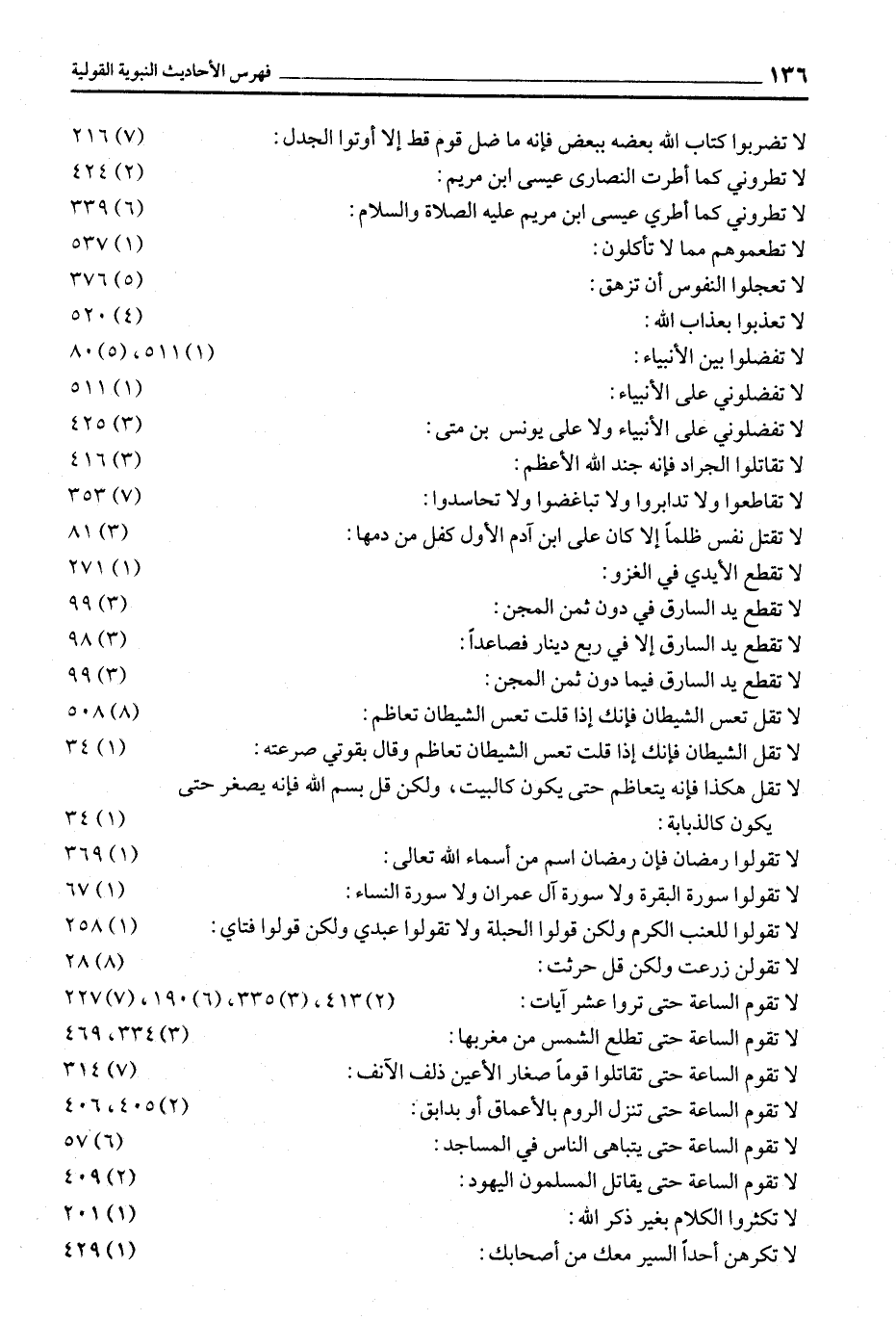 لَا تَضْرِبُوا كِتَابَ اللَّهِ بَعْضَهُ بِبَعْضٍ فَإِنَّهُ مَا ضَلَّ قَوْمٌ قَطُّ إِلَّا أُوتُوا الْجَدَلَ: (7) 216 لَا تُطْرُونِي كَمَا أَطْرَتِ النَّصَارَى عِيسَى ابْنَ مريم: (2) 424 لا تطروني كما أطري عيسى ابن مريم عليه الصلاة والسلام: (6) 339 لا تطعموهم مما لا تأكلون: (1) 537 لا تعجلوا النفوس أن تزهق: (5) 376 لا تعذبوا بعذاب الله: (4) 520 لا تفضلوا بين الأنبياء: (1) 511، (5) 80 لا تفضلوني على الأنبياء: (1) 511 لَا تُفَضِّلُونِي عَلَى الْأَنْبِيَاءِ وَلَا عَلَى يُونُسَ بن متى: (3) 425 لَا تُقَاتِلُوا الْجَرَادَ فَإِنَّهُ جُنْدُ اللَّهِ الْأَعْظَمُ: (3) 416 لَا تَقَاطَعُوا وَلَا تَدَابَرُوا وَلَا تَبَاغَضُوا وَلَا تحاسدوا: (7) 353 لَا تُقْتَلُ نَفْسٌ ظُلْمًا إِلَّا كَانَ عَلَى ابْنِ آدَمَ الأول كفل من دمها: (3) 81 لا تقطع الأيدي في الغزو: (1) 271 لَا تُقْطَعُ يَدُ السَّارِقِ فِي دُونِ ثَمَنِ المجن: (3) 99 لَا تُقْطَعُ يَدُ السَّارِقِ إِلَّا فِي رُبْعِ دينار فصاعدا: (3) 98 لَا تُقْطَعُ يَدُ السَّارِقِ فِيمَا دُونَ ثَمَنِ المجن: (3) 99 لَا تَقُلْ تَعِسَ الشَّيْطَانُ فَإِنَّكَ إِذَا قُلْتَ تعس الشيطان تعاظم: (8) 508 لا تقل الشَّيْطَانُ فَإِنَّكَ إِذَا قُلْتَ تَعِسَ الشَّيْطَانُ تَعَاظَمَ وقال بقوتي صرعته: (1) 34 لَا تَقُلْ هَكَذَا فَإِنَّهُ يَتَعَاظَمُ حَتَّى يَكُونَ كَالْبَيْتِ، وَلَكِنْ قُلْ بِسْمِ اللَّهِ فَإِنَّهُ يَصْغُرُ حتى يكون كالذبابة: (1) 34 لَا تَقُولُوا رَمَضَانَ فَإِنَّ رَمَضَانَ اسْمٌ مِنْ أسماء الله تعالى: (1) 369 لَا تَقُولُوا سُورَةُ الْبَقَرَةِ وَلَا سُورَةُ آلِ عمران ولا سورة النساء: (1) 67 لَا تَقُولُوا لِلْعِنَبِ الْكَرْمَ وَلَكِنْ قُولُوا الْحَبَلَةُ ولا تقولوا عبدي ولكن قولوا فتاي: (1) 258 لا تقولن زرعت ولكن قل حرثت: (8) 28 لَا تَقُومُ السَّاعَةُ حَتَّى تَرَوْا عَشْرَ آيَاتٍ: (2) 413، (3) 335، (6) 190، (7) 227 لَا تَقُومُ السَّاعَةُ حَتَّى تَطْلُعَ الشَّمْسُ مِنْ مغربها: (3) 334، 469 لَا تَقُومُ السَّاعَةُ حَتَّى تُقَاتِلُوا قَوْمًا صِغَارَ الأعين ذلف الآنف: (7) 314 لا تقوم الساعة حتى تنزل الروم بالأعماق أو بدابق: (2) 405، 406 لَا تَقُومُ السَّاعَةُ حَتَّى يَتَبَاهَى النَّاسُ فِي المساجد: (6) 57 لا تقوم الساعة حتى يقاتل المسلمون اليهود: (2) 409 لا تكثروا الكلام بغير ذكر الله: (1) 201 لا تكرهن أحدا السير معك من أصحابك: (1) 429