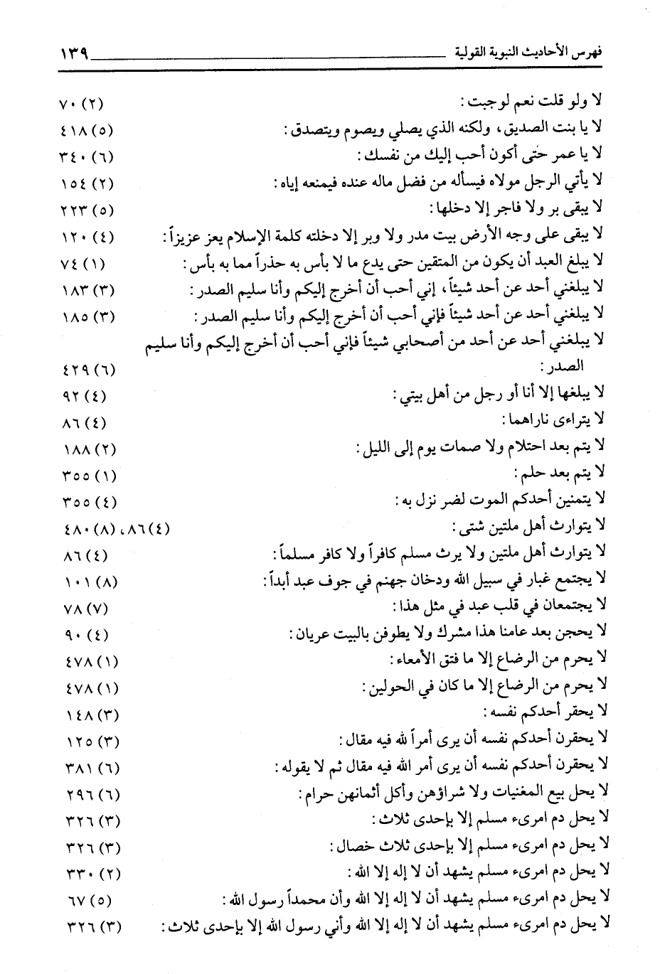 لا ولو قلت نعم لوجبت: (2) 70 لا يَا بِنْتَ الصِّدِّيقِ، وَلَكِنَّهُ الَّذِي يُصَلِّي وَيَصُومُ ويتصدق: (5) 418 لَا يَا عُمَرُ حَتَّى أَكُونَ أَحَبُّ إِلَيْكَ من نفسك: (6) 340 لَا يَأْتِي الرَّجُلُ مَوْلَاهُ فَيَسْأَلُهُ مِنْ فَضْلِ ماله عنده فيمنعه إياه: (2) 154 لَا يَبْقَى بَرٌّ وَلَا فَاجِرٌ إِلَّا دَخَلَهَا: (5) 223 لَا يَبْقَى عَلَى وَجْهِ الْأَرْضِ بَيْتُ مَدَرٍ ولا وبر إلا دخلته كلمة الإسلام يعز عزيزا: (4) 120 لَا يَبْلُغُ الْعَبْدُ أَنْ يَكُونَ مِنَ الْمُتَّقِينَ حَتَّى يَدَعَ مَا لَا بَأْسَ بِهِ حَذَرًا مما به بأس: (1) 74 لَا يُبَلِّغْنِي أَحَدٌ عَنْ أَحَدٍ شَيْئًا، إِنِّي أُحِبُّ أَنْ أَخْرُجَ إِلَيْكُمْ وَأَنَا سَلِيمُ الصَّدْرِ: (3) 183 لَا يُبَلِّغْنِي أَحَدٌ عَنْ أَحَدٍ شَيْئًا فَإِنِّي أُحِبُّ أَنْ أَخْرُجَ إِلَيْكُمْ وَأَنَا سَلِيمُ الصَّدْرِ: (3) 185 لا يبلغني أحد عن أحد من أصحابي شَيْئًا فَإِنِّي أُحِبُّ أَنْ أَخْرُجَ إِلَيْكُمْ وَأَنَا سليم الصدر: (6) 429 لَا يُبَلِّغُهَا إِلَّا أَنَا أَوْ رَجُلٌ مِنْ أهل بيتي: (4) 92 لا يتراءى ناراهما: (4) 86 لَا يُتْمَ بَعْدَ احْتِلَامٍ وَلَا صُمَاتَ يَوْمٍ إلى الليل: (2) 188 لا يتم بعد حلم: (1) 355 لَا يَتَمَنَّيْنَ أَحَدُكُمُ الْمَوْتَ لِضُرٍّ نَزَلَ بِهِ: (4) 355 لَا يَتَمَنَّيْنَ أَحَدُكُمُ الْمَوْتَ لِضُرٍّ نَزَلَ بِهِ: (4) 355 لا يتوارث أهل ملتين شتى: (4) 86، (8) 480 لَا يَتَوَارَثُ أَهْلُ مِلَّتَيْنِ وَلَا يَرِثُ مُسْلِمٌ كافرا ولا كافر مسلما: (4) 86 لَا يَجْتَمِعُ غُبَارٌ فِي سَبِيلِ اللَّهِ وَدُخَانُ جهنم في جوف عبد أبدا: (8) 101 لَا يَجْتَمِعَانِ فِي قَلْبِ عَبْدٍ فِي مِثْلِ هذا: (7) 78 لَا يَحُجَّنَّ بَعْدَ عَامِنَا هَذَا مُشْرِكٌ وَلَا يطوفن بالبيت عريان: (4) 90 لَا يُحَرِّمُ مِنَ الرِّضَاعِ إِلَّا مَا فَتَقَ الأمعاء: (1) 478 لَا يُحَرِّمُ مِنَ الرَّضَاعِ إِلَّا مَا كَانَ في الحولين: (1) 478 لا يحقر أحدكم نفسه: (3) 148 لَا يَحْقِرَنَّ أَحَدُكُمْ نَفْسَهُ أَنْ يَرَى أَمْرًا لله فيه مقال: (3) 125 لَا يُحَقِّرَنَّ أَحَدُكُمْ نَفْسَهُ أَنْ يَرَى أَمْرَ الله فيه مقال ثم لا يقوله: (6) 381 لَا يَحُلُّ بَيْعُ الْمُغَنِّيَاتِ وَلَا شِرَاؤُهُنَّ وَأَكْلُ أثمانهن حرام: (6) 296 لَا يَحِلُّ دَمُ امْرِئٍ مُسْلِمٍ إِلَّا بِإِحْدَى ثلاث: (3) 326 لَا يَحِلُّ دَمُ امْرِئٍ مُسْلِمٍ إِلَّا بِإِحْدَى ثلاث خصال: (3) 326 لَا يَحِلُّ دَمُ امْرِئٍ مُسْلِمٍ يَشْهَدُ أَنْ لا إله إلا الله: (2) 330 لَا يَحِلُّ دَمُ امْرِئٍ مُسْلِمٍ يَشْهَدُ أَنْ لَا إِلَهَ إِلَّا اللَّهُ وَأَنَّ مُحَمَّدًا رَسُولُ الله: (5) 67 لَا يَحِلُّ دَمُ امْرِئٍ مُسْلِمٍ يَشْهَدُ أَنْ لَا إِلَهَ إِلَّا اللَّهُ وَأَنِّي رَسُولُ اللَّهِ إلا بإحدى ثلاث: (3) 326