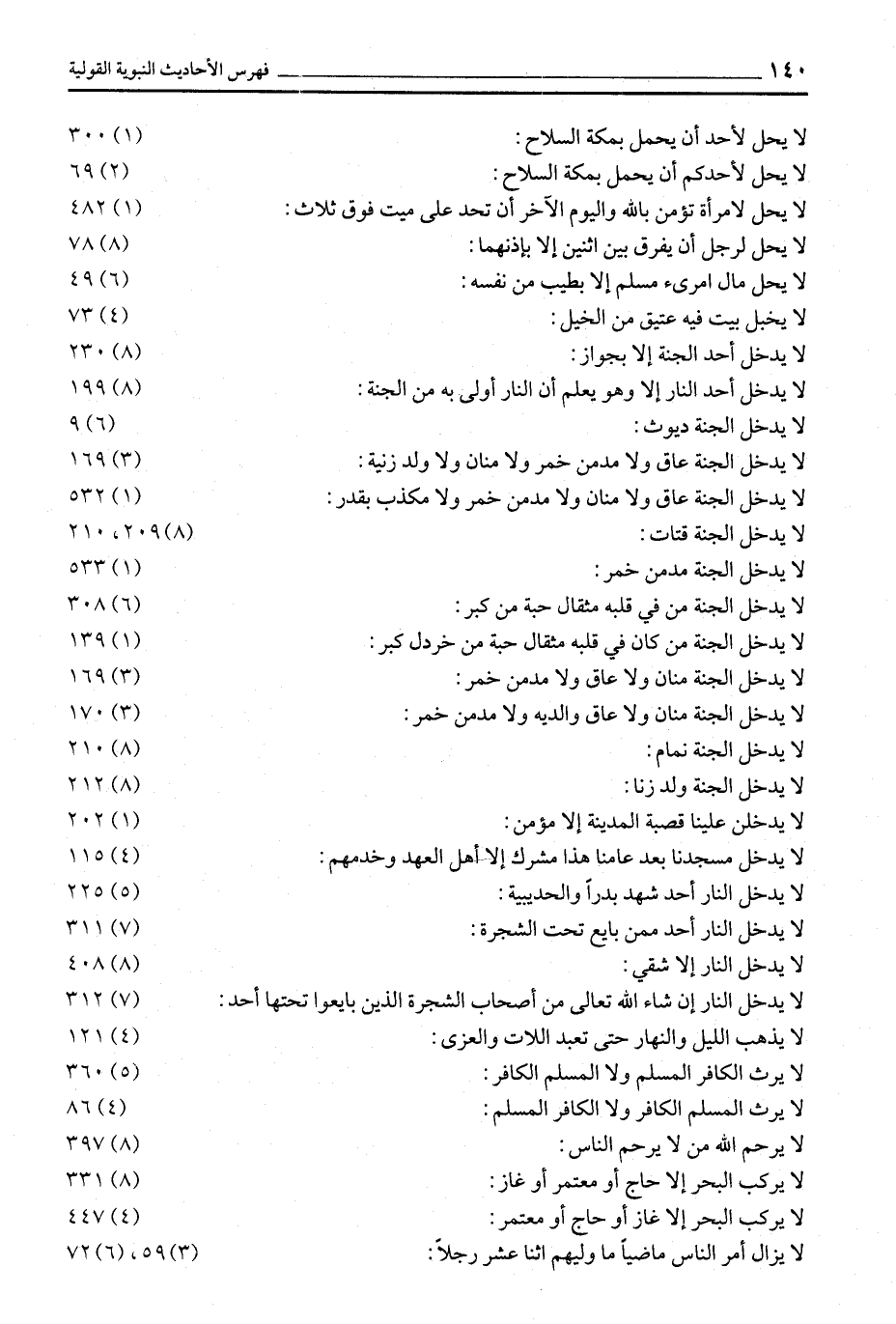 مثقال حبة من كبر: (6) 308 لَا يَدْخُلُ الْجَنَّةَ مَنْ كَانَ فِي قَلْبِهِ مِثْقَالُ حَبَّةٍ مِنْ خردل كبر: (1) 139 لَا يَدْخُلُ الْجَنَّةَ مَنَّانٌ وَلَا عَاقٌّ وَلَا مدمن خمر: (3) 169 لَا يَدْخُلُ الْجَنَّةَ مَنَّانٌ وَلَا عَاقٌّ وَالِدَيْهِ ولا مدمن خمر: (3) 170 لا يدخل الجنة نمام: (8) 210 لا يدخل الجنة ولد زنا: (8) 212 لَا يَدْخُلَنَّ عَلَيْنَا قَصَبَةَ الْمَدِينَةِ إِلَّا مُؤْمِنٌ: (1) 202 لَا يَدْخُلُ مَسْجِدَنَا بَعْدَ عَامِنَا هَذَا مُشْرِكٌ إلا أهل العهد وخدمهم: (4) 115 لَا يَدْخُلُ النَّارَ أَحَدٌ شَهِدَ بَدْرًا وَالْحُدَيْبِيَةَ: (5) 225 لَا يَدْخُلُ النَّارَ أَحَدٌ مِمَّنْ بَايَعَ تَحْتَ الشجرة: (7) 311 لا يدخل النار إلا شقي: (8) 408 لا يدخل النار إن شاء الله تعالى مِنْ أَصْحَابِ الشَّجَرَةِ الَّذِينَ بَايَعُوا تَحْتَهَا أَحَدٌ: (7) 312 لَا يَذْهَبُ اللَّيْلُ وَالنَّهَارُ حَتَّى تُعْبَدَ اللَّاتُ والعزى: (4) 121 لَا يَرِثُ الْكَافِرُ الْمُسْلِمَ وَلَا الْمُسْلِمُ الْكَافِرَ: (5) 360 لَا يَرِثُ الْمُسْلِمُ الْكَافِرَ وَلَا الْكَافِرُ الْمُسْلِمَ: (4) 86 لَا يَرْحَمُ اللَّهُ مَنْ لَا يَرْحَمُ النَّاسَ: (8) 397 لَا يَرْكَبُ الْبَحْرَ إِلَّا حَاجٌّ أَوْ مُعْتَمِرٌ أو غاز: (8) 331 لَا يَرْكَبُ الْبَحْرَ إِلَّا غَازٍ أَوْ حَاجٌّ أو معتمر: (4) 447 لَا يَزَالُ أَمْرُ النَّاسِ مَاضِيًا مَا وَلِيَهُمُ اثنا عشر رجلا: (3) 59، (6) 72