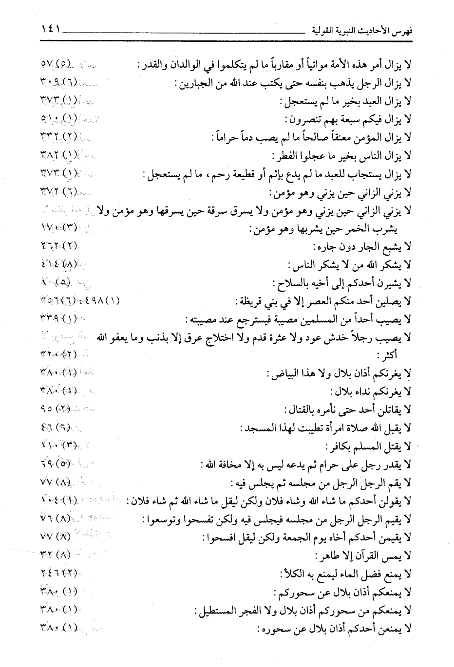 لَا يَزَالُ أَمْرُ هَذِهِ الْأُمَّةِ مُوَاتِيًا أَوْ مقاربا ما لم يتكلموا في الوالدان والقدر: (5) 57 لَا يَزَالُ الرَّجُلُ يَذْهَبُ بِنَفْسِهِ حَتَّى يُكْتَبَ عند الله من الجبارين: (6) 309 لَا يَزَالُ الْعَبْدُ بِخَيْرٍ مَا لَمْ يَسْتَعْجِلْ: (1) 373 لا يزال فيكم سبعة بهم تنصرون: (1) 510 لَا يَزَالُ الْمُؤْمِنُ مُعْنِقًا صَالِحًا مَا لَمْ يصب دما حراما: (2) 332 لَا يَزَالُ النَّاسُ بِخَيْرٍ مَا عَجَّلُوا الْفِطْرَ: (1) 382 لَا يَزَالُ يُسْتَجَابُ لِلْعَبْدِ مَا لَمْ يَدْعُ بِإِثْمٍ أَوْ قَطِيعَةِ رَحِمٍ، مَا لَمْ يَسْتَعْجِلْ: (1) 373 لَا يَزْنِي الزَّانِي حِينَ يَزْنِي وَهُوَ مُؤْمِنٌ: (6) 372 لَا يَزْنِي الزَّانِي حِينَ يَزْنِي وَهُوَ مُؤْمِنٌ وَلَا يَسْرِقُ سَرِقَةً حِينَ يَسْرِقُهَا وَهُوَ مُؤْمِنٌ وَلَا يَشْرَبُ الْخَمْرَ حِينَ يَشْرَبُهَا وَهُوَ مُؤْمِنٌ: (3) 170 لا يشبع الجار دون جاره: (2) 262 لَا يَشْكُرُ اللَّهَ مَنْ لَا يَشْكُرُ النَّاسَ: (8) 414 لا يشيرن أحدكم إلى أخيه بالسلاح: (5) 80 لَا يُصَلِّيَنَّ أَحَدٌ مِنْكُمُ الْعَصْرَ إِلَّا فِي بني قريظة: (1) 498، (6) 356 لَا يُصِيبُ أَحَدًا مِنَ الْمُسْلِمِينَ مُصِيبَةٌ فَيَسْتَرْجِعُ عند مصيبته: (1) 339 لَا يُصِيبُ رَجُلًا خَدْشُ عُودٍ وَلَا عَثْرَةُ قَدَمٍ وَلَا اخْتِلَاجُ عِرْقٍ إِلَّا بِذَنْبٍ وَمَا يعفو الله أكثر: (2) 320 لَا يَغُرَّنَّكُمْ أَذَانُ بِلَالٍ وَلَا هَذَا الْبَيَاضُ: (1) 380 لا يغرنكم نداء بلال: (1) 380 لا يقاتلن أحد حتى نأمره بالقتال: (2) 95 لَا يَقْبَلُ اللَّهُ صَلَاةَ امْرَأَةٍ تَطَيَّبَتْ لِهَذَا المسجد: (6) 46 لا يقتل المسلم بكافر: (3) 110 لَا يَقْدِرُ رَجُلٌ عَلَى حَرَامٍ ثُمَّ يَدَعُهُ ليس به إلا مخافة الله: (5) 69 لَا يُقِمِ الرَّجُلُ الرَّجُلَ مِنْ مَجْلِسِهِ ثُمَّ يجلس فيه: (8) 77 لَا يَقُولَنَّ أَحَدُكُمْ مَا شَاءَ اللَّهُ وَشَاءَ فُلَانٌ وَلَكِنْ لِيَقُلْ مَا شَاءَ اللَّهُ ثُمَّ شاء فلان: (1) 104 لَا يُقِيمُ الرَّجُلُ الرَّجُلَ مِنْ مَجْلِسِهِ فَيَجْلِسَ فيه ولكن تفسحوا وتوسعوا: (8) 76 لَا يُقِيمَنَّ أَحَدُكُمْ أَخَاهُ يَوْمَ الْجُمُعَةِ وَلَكِنْ ليقل افسحوا: (8) 77 لا يمس القرآن إلا طاهر: (8) 32 لَا يُمْنَعُ فَضْلُ الْمَاءِ لِيُمْنَعَ بِهِ الْكَلَأُ: (2) 246 لا يمنعكم أذان بلال عن سحوركم: (1) 380 لَا يَمْنَعُكُمْ مِنْ سُحُورِكُمْ أَذَانُ بِلَالٍ وَلَا الفجر المستطيل: (1) 380 لَا يَمْنَعَنَّ أَحَدَكُمْ أَذَانُ بِلَالٍ عَنْ سُحُورِهِ: (1) 380