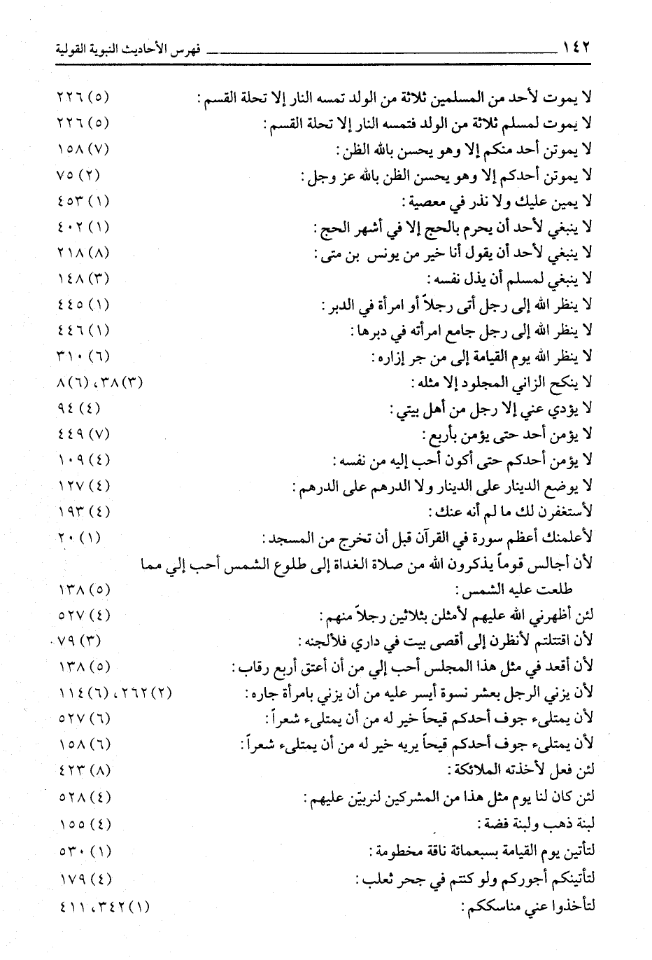 لَا يَمُوتُ لِأَحَدٍ مِنَ الْمُسْلِمِينَ ثَلَاثَةٌ مِنَ الولد تمسه النار إلا تحلة القسم: (5) 226 لا يموت لمسلم ثلاثة من الولد فتمسه النار إلا تحلة القسم: (5) 226 لَا يَمُوتَنَّ أَحَدٌ مِنْكُمْ إِلَّا وَهُوَ يُحْسِنُ بالله الظن: (7) 158 لَا يَمُوتَنَّ أَحَدُكُمْ إِلَّا وَهُوَ يُحْسِنُ الظَّنَّ بالله عز وجل: (2) 75 لَا يَمِينَ عَلَيْكَ وَلَا نَذْرَ فِي مَعْصِيَةِ: (1) 453 لَا يَنْبَغِي لِأَحَدٍ أَنْ يُحْرِمَ بِالْحَجِّ إِلَّا في أشهر الحج: (1) 402 لَا يَنْبَغِي لِأَحَدٍ أَنْ يَقُولَ أَنَا خَيْرٌ مِنْ يُونُسَ بْنِ متى: (8) 218 لا ينبغي لمسلم أن يذل نفسه: (3) 148 لَا يَنْظُرُ اللَّهُ إِلَى رَجُلٍ أَتَى رَجُلًا أو امرأة في الدبر: (1) 445 لَا يَنْظُرُ اللَّهُ إِلَى رَجُلٍ جَامَعَ امْرَأَتَهُ في دبرها: (1) 446 لَا يَنْظُرُ اللَّهُ يَوْمَ الْقِيَامَةِ إِلَى مَنْ جر إزاره: (6) 310 لا ينكح الزاني المجلود إلا مثله: (3) 38، (6) 8 لَا يُؤَدِّي عَنِّي إِلَّا رَجُلٌ مِنْ أَهْلِ بيتي: (4) 94 لا يؤمن أحد حتى يؤمن بأربع: (7) 449 لَا يُؤْمِنُ أَحَدُكُمْ حَتَّى أَكُونَ أَحَبَّ إِلَيْهِ من نفسه: (4) 109 لَا يُوضَعُ الدِّينَارُ عَلَى الدِّينَارِ وَلَا الدِّرْهَمُ على الدرهم: (4) 127 لأستغفرن لك ما لم أنه عنك: (4) 193 لَأُعَلِّمَنَّكَ أَعْظَمَ سُورَةٍ فِي الْقُرْآنِ قَبْلَ أَنْ تخرج من المسجد: (1) 20 لَأَنْ أُجَالِسَ قَوْمًا يَذْكُرُونَ اللَّهَ مِنْ صَلَاةِ الْغَدَاةِ إِلَى طُلُوعِ الشَّمْسِ أَحَبُّ إِلَيَّ مِمَّا طلعت عليه الشمس: (5) 138 لئن أظهرني الله عليهم لأمثلن بثلاثين رجلا منهم: (4) 527 لأن اقْتَتَلْتُمْ لَأَنْظُرَنَّ إِلَى أَقْصَى بَيْتٍ فِي دَارِي فلألجنه: (3) 79 لِأَنْ أَقْعُدَ فِي مِثْلِ هَذَا الْمَجْلِسِ أَحَبُّ إليّ من أن أعتق أربع رقاب: (5) 138 لَأَنْ يَزْنِيَ الرَّجُلُ بِعَشْرِ نِسْوَةٍ أَيْسَرُ عَلَيْهِ من أن يزني بامرأة جاره: (2) 262، (6) 114 لأن يمتلئ جوف أحدكم قيحا خير له من أن يمتلئ شعرا: (6) 527 لَأَنْ يَمْتَلِئَ جَوْفُ أَحَدِكُمْ قَيْحًا يَرِيهِ خَيْرٌ له من أن يمتلئ شعرا: (6) 158 لئن فعل لأخذته