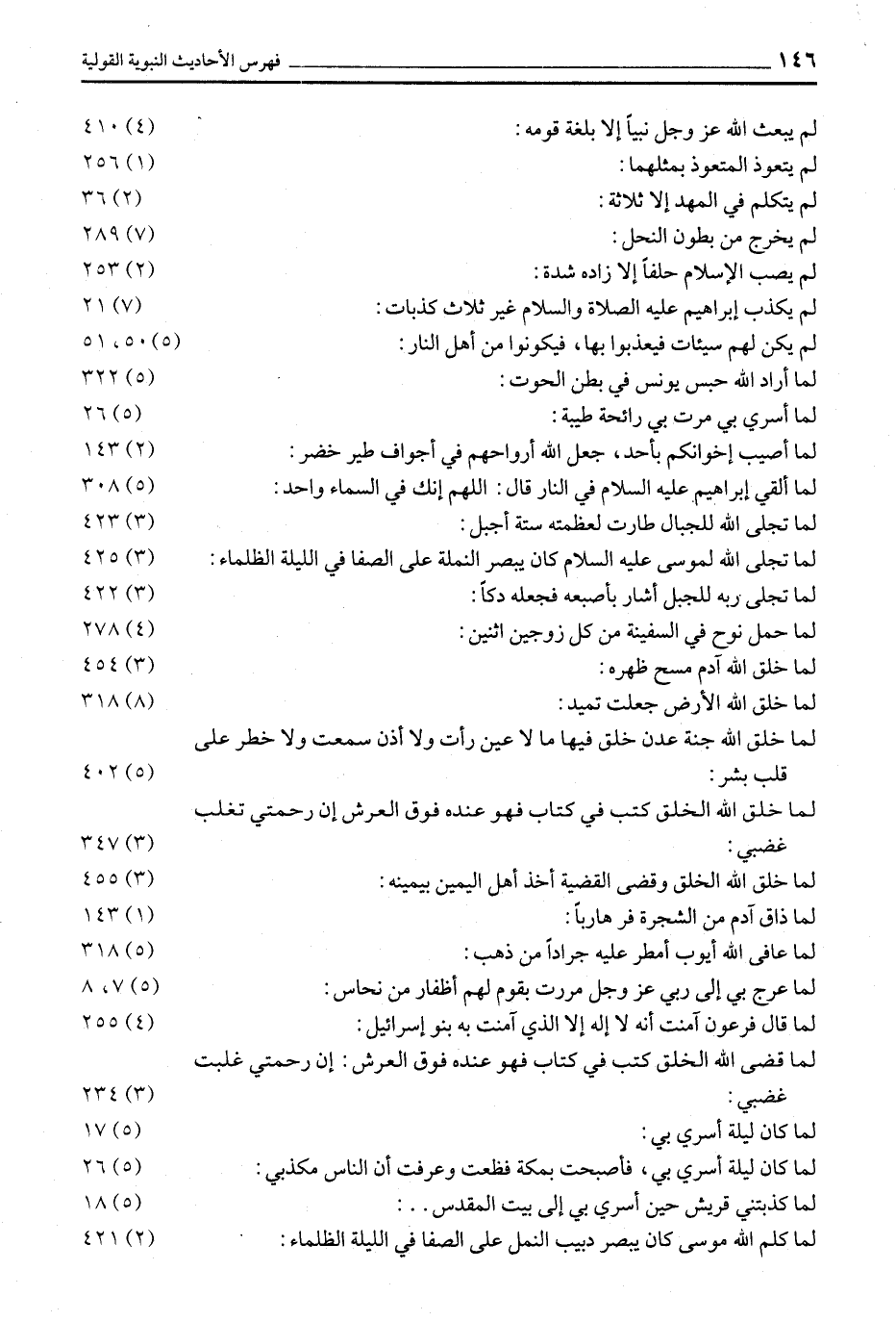 لَمْ يَبْعَثِ اللَّهُ عَزَّ وَجَلَّ نَبِيًّا إِلَّا بلغة قومه: (4) 410 لم يتعوذ المتعوذ بمثلهما: (1) 256 لم يتكلم في المهد إلا ثلاثة: (2) 36 لم يخرج من بطون النحل: (7) 289 لَمْ يُصِبِ الْإِسْلَامُ حِلْفًا إِلَّا زَادَهُ شِدَّةً: (2) 253 لَمْ يَكْذِبْ إِبْرَاهِيمُ عَلَيْهِ الصَّلَاةُ وَالسَّلَامُ غَيْرَ ثلاث كذبات: (7) 21 لَمْ يَكُنْ لَهُمْ سَيِّئَاتٌ فَيُعَذَّبُوا بِهَا، فَيَكُونُوا من أهل النار: (5) 50، 51 لَمَّا أَرَادَ اللَّهُ حَبْسَ يُونُسَ فِي بَطْنِ الحوت: (5) 322 لَمَّا أُسْرِيَ بِي مَرَّتْ بِي رَائِحَةٌ طَيِّبَةٌ: (5) 26 لَمَّا أُصِيبَ إِخْوَانُكُمْ بِأُحُدٍ، جَعَلَ اللَّهُ أَرْوَاحَهُمْ في أجواف طير خضر: (2) 143 لَمَّا أُلْقِيَ إِبْرَاهِيمُ عَلَيْهِ السَّلَامُ فِي النَّارِ قال: اللهم إنك في السماء واحد: (5) 308 لَمَّا تَجَلَّى اللَّهُ لِلْجِبَالِ طَارَتْ لِعَظَمَتِهِ سِتَّةُ أجبل: (3) 423 لَمَّا تَجَلَّى اللَّهُ لِمُوسَى عَلَيْهِ السَّلَامُ كَانَ يُبْصِرُ النَّمْلَةَ عَلَى الصَّفَا فِي اللَّيْلَةِ الظَّلْمَاءِ: (3) 425 لَمَّا تَجَلَّى رَبُّهُ لِلْجَبَلِ أَشَارَ بِإِصْبَعِهِ فَجَعَلَهُ دكا: (3) 422 لَمَّا حَمَلَ نُوحٌ فِي السَّفِينَةِ مِنْ كُلِّ زوجين اثنين: (4) 278 لما خلق الله آدم مسح ظهره: (3) 454 لما خلق الله الأرض جعلت تميد: (8) 318 لَمَّا خَلَقَ اللَّهُ جَنَّةَ عَدْنٍ خَلَقَ فِيهَا مَا لَا عَيْنٌ رَأَتْ وَلَا أُذُنٌ سَمِعَتْ وَلَا خطر على قلب بشر: (5) 402 لما خلق الله الخلق كتب في كتاب فهو عِنْدَهُ فَوْقَ الْعَرْشِ إِنَّ رَحْمَتِي تَغْلِبُ غَضَبِي: (3) 347 لَمَّا خَلَقَ اللَّهُ الْخَلْقَ وَقَضَى الْقَضِيَّةَ أَخَذَ أهل اليمين بيمينه: (3) 455 لَمَّا ذَاقَ آدَمُ مِنَ الشَّجَرَةِ فَرَّ هَارِبًا: (1) 143 لَمَّا عَافَى اللَّهُ أَيُّوبَ أَمْطَرَ عَلَيْهِ جَرَادًا من ذهب: (5) 318 لما عرج بي إلى رَبِّي عَزَّ وَجَلَّ مَرَرْتُ بِقَوْمٍ لَهُمْ أَظْفَارٌ من نحاس: (5) 7، 8 لَمَّا قَالَ فِرْعَوْنُ آمَنْتُ أَنَّهُ لَا إِلَهَ إِلَّا الَّذِي آمَنَتْ به بنو إسرائيل: (4) 255 لما قضى الله الخلق كتب في كتاب فَهُوَ عِنْدَهُ فَوْقَ الْعَرْشِ: إِنَّ رَحْمَتِي غَلَبَتْ غضبي: (3) 234 لما كان ليلة