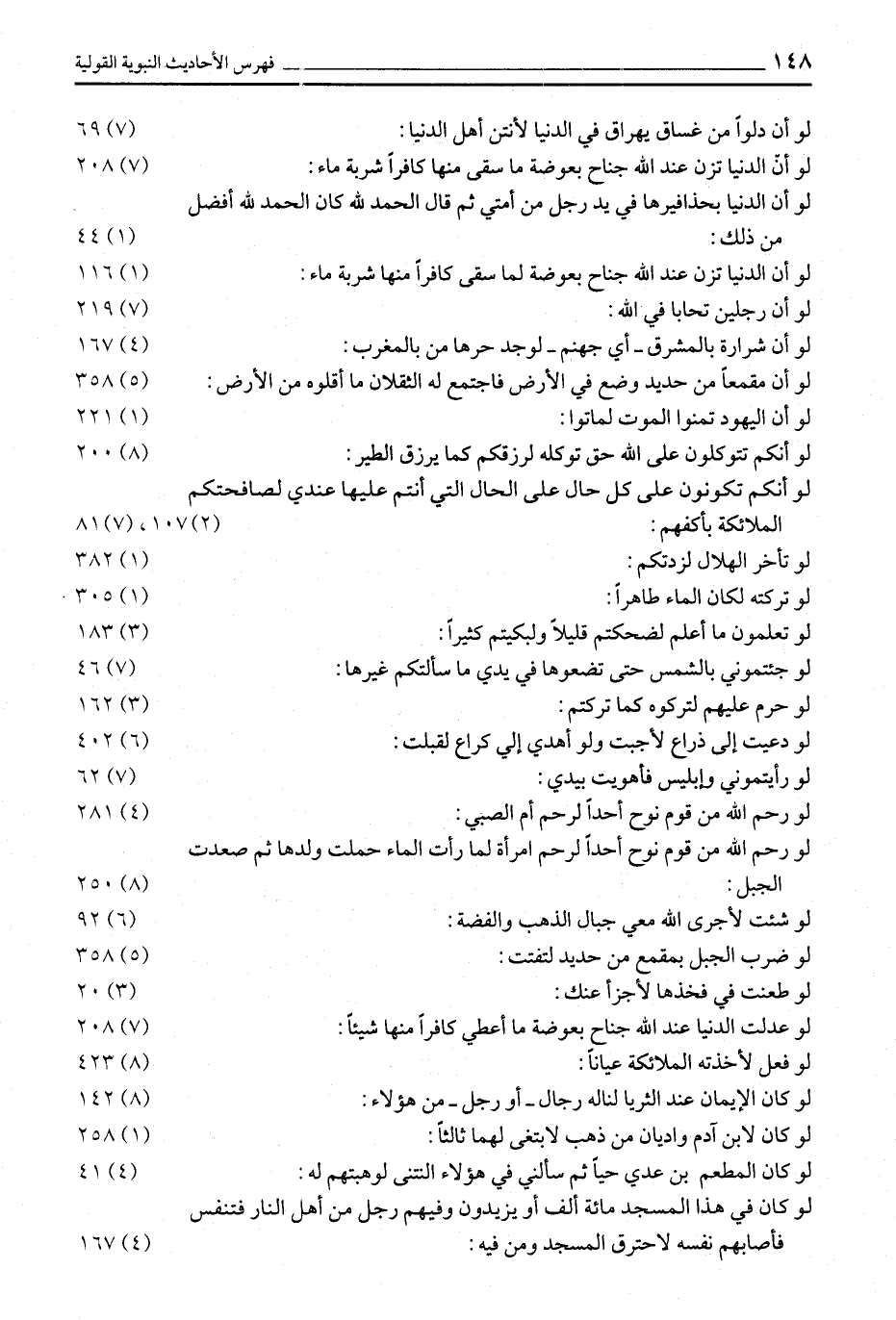 لَوْ أَنَّ دَلْوًا مِنْ غَسَّاقٍ يُهَرَاقُ فِي الدُّنْيَا لأنتن أهل الدنيا: (7) 69 لَوْ أَنَّ الدُّنْيَا تَزِنُ عِنْدَ اللَّهِ جَنَاحَ بَعُوضَةٍ مَا سَقَى مِنْهَا كَافِرًا شَرْبَةَ مَاءٍ: (7) 208 لَوْ أَنَّ الدُّنْيَا بِحَذَافِيرِهَا فِي يَدِ رَجُلٍ من أمتي ثم قال الحمد لله كان الحمد لله أفضل من ذلك: (1) 44 لَوْ أَنَّ الدُّنْيَا تَزِنُ عِنْدَ اللَّهِ جَنَاحَ بعوضة لما سقى كافرا منها شربة ماء: (1) 116 لو أن رجلين تحابا في الله: (7) 219 لو أن شرارة بالمشرق- أي جهنم- لوجد حرها من بالمغرب: (4) 167 لَوْ أَنَّ مِقْمَعًا مِنْ حَدِيدٍ وُضِعَ فِي الْأَرْضِ فَاجْتَمَعَ لَهُ الثَّقَلَانِ مَا أَقَلُّوهُ مِنَ الأرض: (5) 358 لو أن اليهود تمنوا الموت لماتوا: (1) 221 لَوْ أَنَّكُمْ تَتَوَكَّلُونَ عَلَى اللَّهِ حَقَّ تَوَكُّلِهِ لرزقكم كما يرزق الطير: (8) 200 لَوْ أَنَّكُمْ تَكُونُونَ عَلَى كُلِّ حَالٍ عَلَى الْحَالِ الَّتِي أَنْتُمْ عَلَيْهَا عِنْدِي لَصَافَحَتْكُمُ الْمَلَائِكَةُ بأكفهم: (2) 107، (7) 81 لو تأخر الهلال لزدتكم: (1) 382 لو تركته لكان الماء طاهرا: (1) 305 لَوْ تَعْلَمُونَ مَا أَعْلَمُ لَضَحِكْتُمْ قَلِيلًا وَلَبَكَيْتُمْ كثيرا: (3) 183 لَوْ جِئْتُمُونِي بِالشَّمْسِ حَتَّى تَضَعُوهَا فِي يَدِي ما سألتكم غيرها: (7) 46 لو حرم عليهم لتركوه كما تركتم: (3) 162 لَوْ دُعِيتُ إِلَى ذِرَاعٍ لَأَجَبْتُ وَلَوْ أُهْدِيَ إلى كراع لقبلت: (6) 402 لو رأيتموني وإبليس فأهويت بيدي: (7) 62 لَوْ رَحِمَ اللَّهُ مِنْ قَوْمِ نُوحٍ أَحَدًا لرحم أم الصبي: (4) 281 لَوْ رَحِمَ اللَّهُ مِنْ قَوْمِ نُوحٍ أَحَدًا لَرَحِمَ امْرَأَةً لَمَّا رَأَتِ الْمَاءَ حَمَلَتْ وَلَدَهَا ثم صعدت الجبل: (8) 250 لَوْ شِئْتُ لَأَجْرَى اللَّهُ مَعِي جِبَالَ الذَّهَبِ والفضة: (6) 92 لَوْ ضُرِبَ الْجَبَلُ بِمِقْمَعٍ مِنْ حَدِيدٍ لَتَفَتَّتَ: (5) 358 لو طعنت في فخذها لأجزأ عنك: (3) 20 لو عدلت الدنيا عند الله جَنَاحَ بَعُوضَةٍ مَا أَعْطَى كَافِرًا مِنْهَا شَيْئًا: (7) 208 لو فعل لأخذته الملائكة عيانا: (8) 423 لَوْ كَانَ الْإِيمَانُ عِنْدَ الثُّرَيَّا لَنَالَهُ رِجَالٌ- أو رجل- من هؤلاء: (8) 142 لو كان لابن آدم واديان من ذهب لابتغى لهما ثالثا: (1) 258 لو كان المطعم بن عدي حَيًّا ثُمَّ سَأَلَنِي فِي هَؤُلَاءِ النَّتْنَى لَوَهَبْتُهُمْ له: (4) 41 لو كان في هَذَا الْمَسْجِدُ مِائَةَ أَلْفٍ أَوْ يَزِيدُونَ وَفِيهِمْ رَجُلٌ مِنْ أَهْلِ النَّارِ فَتَنَفَّسَ فَأَصَابَهُمْ نَفَسُهُ لاحترق المسجد ومن فيه: (4) 167