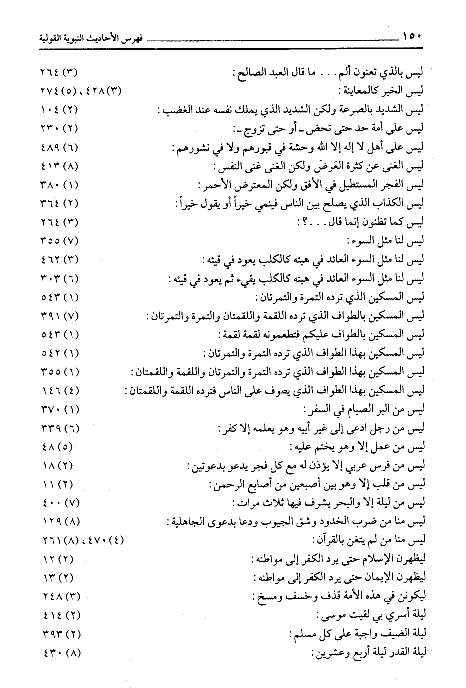 ليس بالذي تعنون ألم ... ما قال العبد الصالح: (3) 264 ليس الخبر كالمعاينة: (3) 428، (5) 274 لَيْسَ الشَّدِيدُ بِالصُّرَعَةِ وَلَكِنَّ الشَّدِيدَ الَّذِي يَمْلِكُ نفسه عند الغضب: (2) 104 ليس على أمة حد حتى تحض- أو حتى تزوج-: (2) 230 لَيْسَ عَلَى أَهْلِ لَا إِلَهَ إِلَّا اللَّهُ وحشة في قبورهم ولا في نشورهم: (6) 489 لَيْسَ الْغِنَى عَنْ كَثْرَةِ الْعَرَضِ وَلَكِنَّ الْغِنَى غنى النفس: (8) 413 ليس الفجر المستطيل في الأفق ولكن المعترض الأحمر: (1) 380 لَيْسَ الْكَذَّابُ الَّذِي يُصْلِحُ بَيْنَ النَّاسِ فَيَنْمِي خيرا أو يقول خيرا: (2) 364 ليس كما تظنون إنما قال ... ؟: (3) 264
