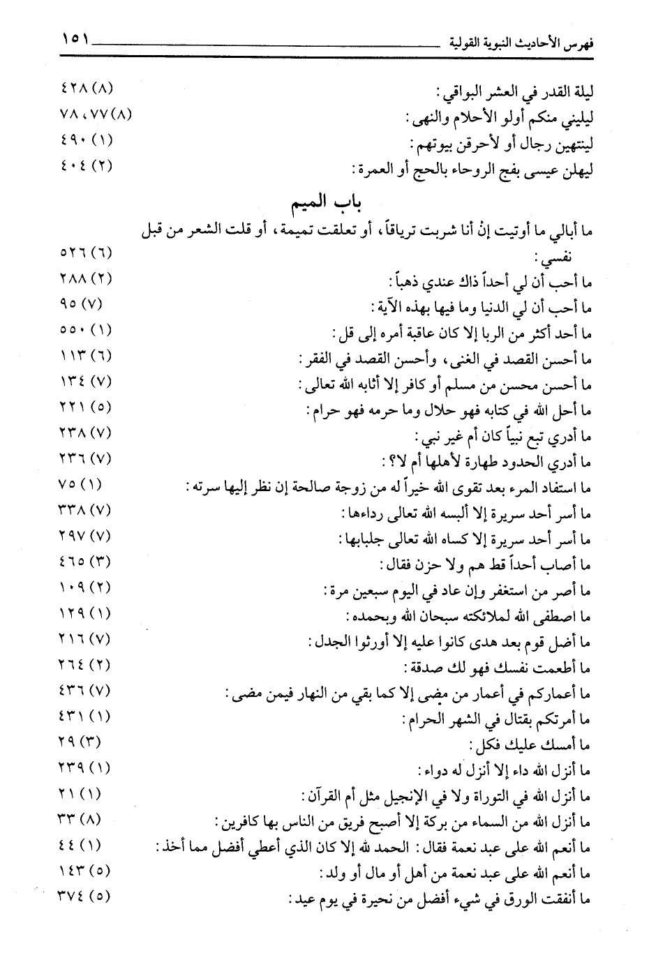 مَا أُبَالِي مَا أُوتِيْتُ إِنْ أَنَا شَرِبْتُ تِرْيَاقًا، أَوْ تَعَلَّقْتُ تَمِيمَةً، أَوْ قُلْتُ الشِّعْرَ من قبل نفسي: (6) 526 مَا أُحِبُّ أَنَّ لِي أُحُدًا ذَاكَ عِنْدِي ذهبا: (2) 288 مَا أُحِبُّ أَنَّ لِيَ الدُّنْيَا وَمَا فِيهَا بهذه الآية: (7) 95 مَا أَحَدٌ أَكْثَرَ مِنَ الرِّبَا إِلَّا كَانَ عاقبة أمره إلى قل: (1) 550 مَا أَحْسَنَ الْقَصْدَ فِي الْغِنَى، وَأَحْسَنَ الْقَصْدَ في الفقر: (6) 113 مَا أَحْسَنَ مُحْسِنٌ مِنْ مُسْلِمٍ أَوْ كَافِرٍ إلا أثابه الله تعالى: (7) 134 مَا أَحَلَّ اللَّهُ فِي كِتَابِهِ فَهُوَ حَلَالٌ وما حرمه فهو حرام: (5) 221 مَا أَدْرِي تُبَّعٌ نَبِيًّا كَانَ أَمْ غَيْرَ نبي: (7) 238 مَا أَدْرِي الْحُدُودُ طَهَّارَةٌ لِأَهْلِهَا أَمْ لَا؟: (7) 236 مَا اسْتَفَادَ الْمَرْءُ بَعْدَ تَقْوَى اللَّهِ خَيْرًا له مِنْ زَوْجَةٍ صَالِحَةٍ إِنْ نَظَرَ إِلَيْهَا سَرَّتْهُ: (1) 75 مَا أَسَرَّ أَحَدٌ سَرِيرَةً إِلَّا أَلْبَسُهُ اللَّهُ تعالى رداءها: (7) 338 مَا أَسَرَّ أَحَدٌ سَرِيرَةً إِلَّا كَسَاهُ اللَّهُ تعالى جلبابها: (7) 297 مَا أَصَابَ أَحَدًا قَطُّ هَمٌّ وَلَا حُزْنٌ فقال: (3) 465 مَا أَصَرَّ مَنِ اسْتَغْفَرَ وَإِنْ عَادَ فِي اليوم سبعين مرة: (2) 109 مَا اصْطَفَى اللَّهُ لِمَلَائِكَتِهِ سُبْحَانَ اللَّهِ وَبِحَمْدِهِ: (1) 129 ما أضل قَوْمٌ بَعْدَ هُدًى كَانُوا عَلَيْهِ إِلَّا أُورِثُوا الجدل: (7) 216 ما أطعمت نفسك فهو لك صدقه: (2) 264 مَا أَعْمَارُكُمْ فِي أَعْمَارِ مَنْ مَضَى إِلَّا كما بقي من النهار فيمن مضى: (7) 436 ما أمرتكم بقتال في الشهر الحرام: (1) 431 ما أمسك عليك فكل: (3) 29 مَا أَنْزَلَ اللَّهُ دَاءً إِلَّا أَنْزَلَ لَهُ دواء: (1) 239 مَا أَنْزَلَ اللَّهُ فِي التَّوْرَاةِ وَلَا فِي الإنجيل مثل أم القرآن: (1) 21 مَا أَنْزَلَ اللَّهُ مِنَ السَّمَاءِ مِنْ بَرَكَةٍ إِلَّا أَصْبَحَ فَرِيقٌ مِنَ النَّاسِ بِهَا كَافِرِينَ: (8) 33 مَا أَنْعَمَ اللَّهُ عَلَى عَبْدٍ نِعْمَةً فَقَالَ: الْحَمْدُ لِلَّهِ إِلَّا كَانَ الَّذِي أَعْطَى أَفْضَلَ مما أخذ: (1) 44 مَا أَنْعَمَ اللَّهُ عَلَى عَبْدٍ نِعْمَةً مِنْ أهل أو مال أو ولد: (5) 143 مَا أُنْفِقَتِ الْوَرِقُ فِي شَيْءٍ أَفْضَلُ مِنْ نحيرة في يوم عيد: (5) 374