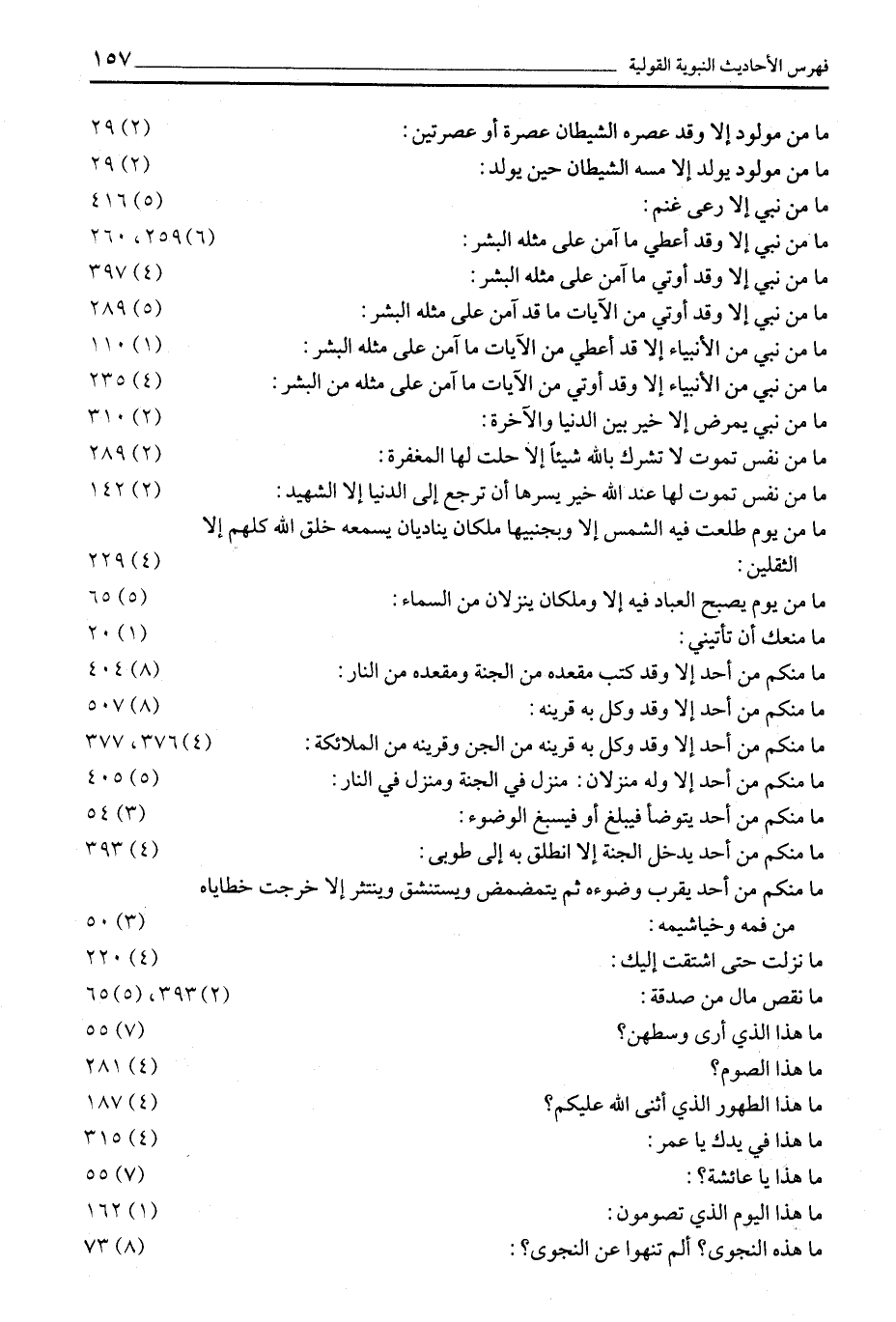 : (8) 507 مَا مِنْكُمْ مِنْ أَحَدٍ إِلَّا وَقَدْ وُكِّلَ بِهِ قَرِينُهُ مِنَ الْجِنِّ وَقَرِينُهُ مِنَ الْمَلَائِكَةِ: (4) 376، 377 مَا مِنْكُمْ مِنْ أَحَدٍ إِلَّا وَلَهُ مَنْزِلَانِ: منزل في الجنة ومنزل في النار: (5) 405 مَا مِنْكُمْ مِنْ أَحَدٍ يَتَوَضَّأُ فَيُبْلِغَ أَوْ فيسبغ الوضوء: (3) 54 مَا مِنْكُمْ مِنْ أَحَدٍ يَدْخُلُ الْجَنَّةَ إِلَّا انطلق به إلى طوبى: (4) 393 مَا مِنْكُمْ مِنْ أَحَدٍ يَقْرَبُ وُضُوءُهُ ثُمَّ يتمضمض ويستنشق وينتثر إلا خرجت خطاياه من فمه وخياشيمه: (3) 50 ما نزلت حتى اشتقت إليك: (4) 220 ما نقص مال من صدقة: (2) 393، (5) 65 ما هذا الذي أرى وسطهن؟ (7) 55 ما هذا الصوم؟ (4) 281 مَا هَذَا الطَّهُورُ الَّذِي أَثْنَى اللَّهُ عَلَيْكُمْ؟ (4) 187 ما هذا في يدك يا عمر: (4) 315 ما هذا يا عائشة؟: (7) 55 ما هذا اليوم الذي تصومون: (1) 162 ما هذه النجوى؟ ألم تنهوا عن النجوى؟: (8) 73