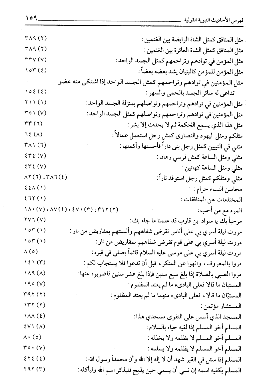 مَثَلُ الْمُنَافِقِ كَمَثَلِ الشَّاةِ الرَّابِضَةِ بَيْنَ الْغَنَمَيْنِ: (2) 389 مَثَلُ الْمُنَافِقِ كَمَثَلِ الشَّاةِ الْعَائِرَةِ بَيْنَ الْغَنَمَيْنِ: (2) 389 مثل المؤمن في توادهم وتراحمهم كمثل الجسد الواحد: (7) 337 مثل المؤمن للمؤمن كالبنيان يشد بعضه بعضا: (4) 153 مَثَلُ الْمُؤْمِنِينَ فِي تَوَادِّهِمْ وَتَرَاحُمِهِمْ كَمَثَلِ الْجَسَدِ الْوَاحِدِ إِذَا اشْتَكَى مِنْهُ عُضْوٌ تَدَاعَى لَهُ سائر الجسد بالحمى والسهر: (4) 154 مَثَلُ الْمُؤْمِنِينَ فِي تَوَادِّهِمْ وَتَرَاحُمِهِمْ وَتَوَاصُلِهِمْ بِمَنْزِلَةِ الجسد الواحد: (1) 211 مَثَلُ الْمُؤْمِنِينَ فِي تَوَادِّهِمْ وَتَرَاحُمِهِمْ وَتَوَاصُلِهِمْ كَمَثَلِ الجسد الواحد: (7) 351 مثل هذا الَّذِي يَسْمَعُ الْحِكْمَةَ ثُمَّ لَا يُحَدِّثُ إِلَّا بشر: (6) 33 مَثَلُكُمْ وَمَثَلُ الْيَهُودِ وَالنَّصَارَى كَمَثَلِ رَجُلٍ اسْتَعْمَلَ عُمَّالًا: (8) 64 مَثَلِي فِي النَّبِيِّينَ كَمَثَلِ رَجُلٍ بَنَى دَارًا فأحسنها وأكملها: (6) 381 مثلي ومثل الساعة كمثل فرسي رهان: (7) 434 مثلي ومثل الساعة كهاتين: (7) 434 مثلي ومثلكم كمثل رجل استوقد نارا: (4) 386، (6) 82 محاسن النساء حرام: (1) 448 المختلعات هن المنافقات: (1) 462 المرء مع من أحب: (2) 312، (3) 471، (4) 87، (7) 180 مَرْحَبًا بِكَ يَا سَوَادُ بْنَ قَارِبٍ قَدْ علمنا ما جاء بك: (7) 276 مَرَرْتُ لَيْلَةَ أُسْرِيَ بِي عَلَى أُنَاسٍ تُقْرَضُ شفاههم وألسنتهم بمقاريض من نار: (1) 153 مررت ليلة أسري بي على قوم تقرض شفاههم بمقاريض من نار: (1) 153 مَرَرْتُ لَيْلَةَ أُسْرِيَ بِي عَلَى مُوسَى عَلَيْهِ السلام قائما يصلي في قبره: (5) 8 مُرُوا بِالْمَعْرُوفِ، وانْهَوْا عَنِ الْمُنْكَرِ، قَبْلَ أَنْ تدعوا فلا يستجاب لكم: (3) 146 مُرُوا الصَّبِيَّ بِالصَّلَاةِ إِذَا بَلَغَ سَبْعَ سِنِينَ فإذا بلغ عشر سنين فاضربوه عنها: (8) 189 الْمُسْتَبَّانُ مَا قَالَا فَعَلَى الْبَادِئِ مَا لَمْ يعتد المظلوم: (7) 195 الْمُسْتَبَّانِ مَا قَالَا، فَعَلَى الْبَادِئِ مِنْهُمَا مَا لم يعتد المظلوم: (2) 392 المستشار مؤتمن: (2) 132 الْمَسْجِدُ الَّذِي أُسِّسَ عَلَى التَّقْوَى مَسْجِدِي هَذَا: (4) 188 الْمُسْلِمُ أَخُو الْمُسْلِمِ إِذَا لَقِيَهُ حَيَّاهُ بِالسَّلَامِ: (8) 471 الْمُسْلِمُ أَخُو الْمُسْلِمِ لَا يَظْلِمُهُ وَلَا يَخْذُلُهُ: (5) 80 الْمُسْلِمُ أَخُو الْمُسْلِمِ لَا يَظْلِمُهُ وَلَا يُسْلِمُهُ: (7) 350 اَلْمُسْلِمُ إِذَا سُئِلَ فِي الْقَبْرِ شَهِدَ أَنْ لَا إِلَهَ إِلَّا اللَّهُ وَأَنَّ مُحَمَّدًا رَسُولُ الله: (4) 424 الْمُسْلِمُ يَكْفِيهِ اسْمُهُ إِنْ نَسِيَ أَنْ يُسَمِّيَ حين يذبح فليذكر اسم الله وليأكله: (3) 292