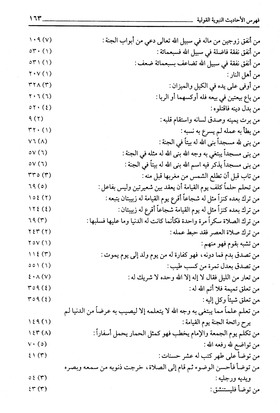 مَنْ أَنْفَقَ زَوْجَيْنِ مِنْ مَالِهِ فِي سَبِيلِ الله تعالى دعي من أبواب الجنة: (7) 109 مَنْ أَنْفَقَ نَفَقَةً فَاضِلَةً فِي سَبِيلِ اللَّهِ فسبعمائة: (1) 530 مَنْ أَنْفَقَ نَفَقَةً فِي سَبِيلِ اللَّهِ تُضَاعَفُ بسبعمائة ضعف: (1) 531 من أهل النار: (1) 207 مِنْ أَوْفَى عَلَى يَدِهِ فِي الْكَيْلِ وَالْمِيزَانِ: (3) 328 مَنْ بَاعَ بَيْعَتَيْنِ فِي بَيْعَةٍ فَلَهُ أَوَكَسُهُمَا أو الربا: (6) 206 من بدل دينه فاقتلوه: (4) 520 مَنْ بَرَّتْ يَمِينُهُ وَصَدَقَ لِسَانُهُ وَاسْتَقَامَ قَلْبُهُ: (2) 9 من بطأ به عمله لم يسرع به نسبه: (1) 320 مَنْ بَنَى لِلَّهِ مَسْجِدًا بَنَى اللَّهُ لَهُ بيتا في الجنة: (8) 76 مَنْ بَنَى مَسْجِدًا يَبْتَغِي بِهِ وَجْهَ اللَّهِ بنى الله له مثله في الجنة: (6) 57 مَنْ بَنَى مَسْجِدًا يُذْكَرُ فِيهِ اسْمُ اللَّهِ بنى الله له بيتا في الجنة: (6) 57 مَنْ تَابَ قَبْلَ أَنْ تَطْلُعَ الشَّمْسُ مِنْ مغربها قبل منه: (3) 335 مَنْ تَحَلَّمَ حُلْمًا كُلِّفَ يَوْمَ الْقِيَامَةِ أَنْ يعقد بين شعيرتين وليس بفاعل: (5) 69 مَنْ تَرَكَ بَعْدَهُ كَنْزًا مُثِّلَ لَهُ شُجَاعًا أقرع يوم القيامة له زبيبتان يتبعه: (2) 154 مَنْ تَرَكَ بَعْدَهُ كَنْزًا مُثِّلَ لَهُ يَوْمَ القيامة شجاعا أقرع له زبيبتان: (4) 124 مَنْ تَرَكَ الصَّلَاةَ سُكْرًا مَرَّةً وَاحِدَةً فَكَأَنَّمَا كانت له الدنيا وما عليها فسلبها: (3) 69 مَنْ تَرَكَ صَلَاةَ الْعَصْرِ فَقَدْ حَبِطَ عَمَلُهُ: (2) 243 من تشبه بقوم فهو منهم: (1) 257 مَنْ تَصَدَّقَ بِدَمٍ فَمَا دَوُنَهُ، فَهُوَ كَفَّارَةٌ لَهُ مِنْ يَوْمِ وُلِدَ إِلَى يَوْمِ يَمُوتُ: (3) 114 من تصدق بعدل تمرة من كسب طيب: (1) 551 مَنْ تَعَارَّ مِنَ اللَّيْلِ فَقَالَ لَا إِلَهَ إِلَّا اللَّهُ وَحْدَهُ لَا شَرِيكَ له: (7) 408 مَنْ تَعَلَّقَ تَمِيمَةً فَلَا أَتَمَّ اللَّهُ لَهُ: (4) 359 من تعلق شيئا وكل إليه: (4) 359 مَنْ تَعَلَّمَ عِلْمًا مِمَّا يُبْتَغَى بِهِ وَجْهُ اللَّهِ لَا يَتَعَلَّمُهُ إِلَّا لِيُصِيبَ بِهِ عَرَضًا مِنَ الدُّنْيَا لَمْ يَرُحْ رَائِحَةَ الْجَنَّةِ يَوْمَ القيامة: (1) 149 مَنْ تَكَلَّمَ يَوْمَ الْجُمُعَةِ وَالْإِمَامُ يَخْطُبُ فَهُوَ كمثل الحمار يحمل أسفارا: (8) 143 من تواضع لله رفعه الله: (5) 70 مَنْ تَوَضَّأَ عَلَى طُهْرٍ كُتِبَ لَهُ عَشْرُ حسنات: (3) 41 مَنْ تَوَضَّأَ فَأَحْسَنَ الْوُضُوءَ ثُمَّ قَامَ إِلَى الصَّلَاةِ، خَرَجَتْ ذُنُوبُهُ مِنْ سَمْعِهِ وَبَصَرِهِ وَيَدَيْهِ ورجليه: (3) 54 من توضأ فليستنشق: (3) 43