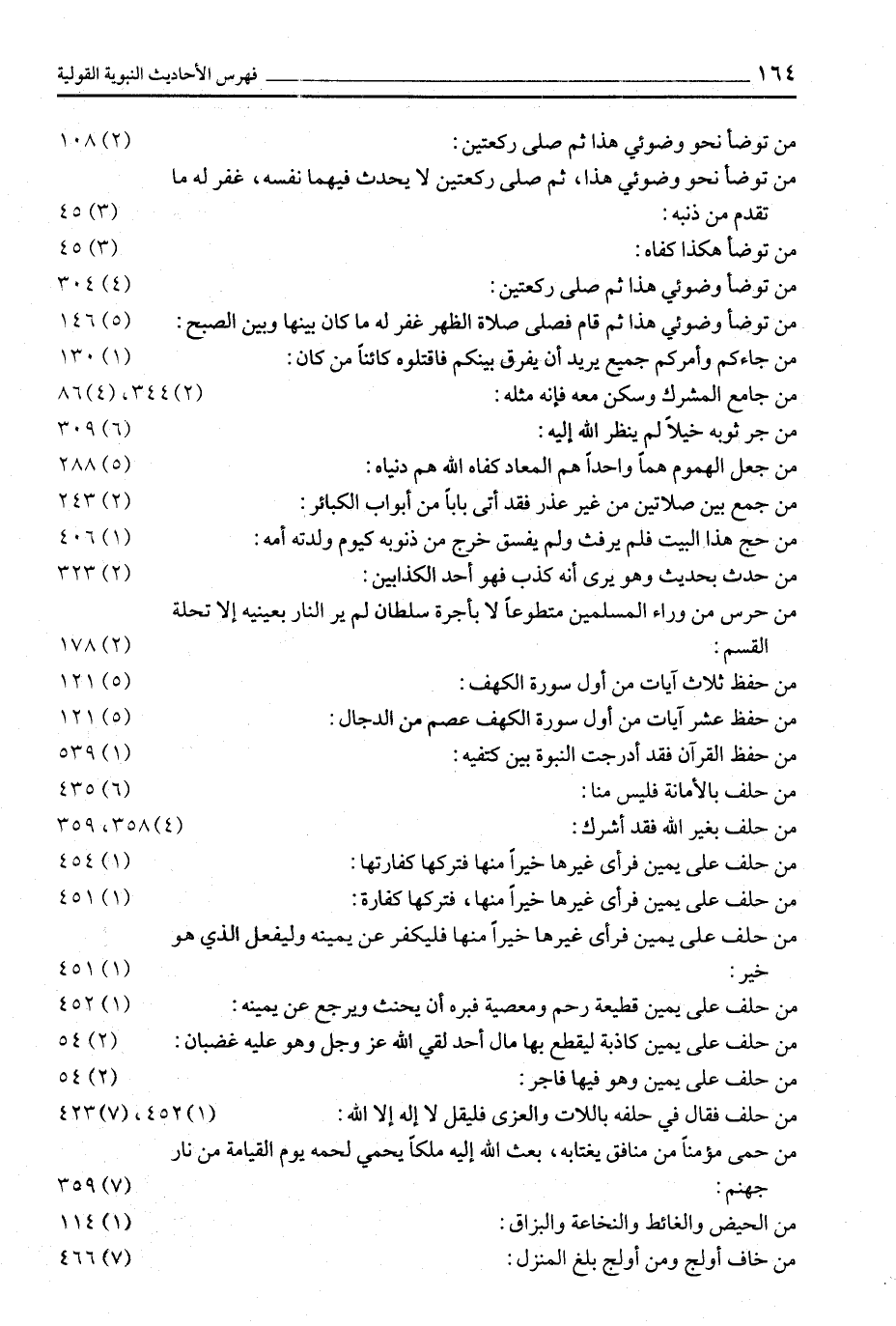 مَنْ تَوَضَّأَ نَحْوَ وُضُوئِي هَذَا ثُمَّ صَلَّى ركعتين: (2) 108 مَنْ تَوَضَّأَ نَحْوَ وُضُوئِي هَذَا، ثُمَّ صَلَّى رَكْعَتَيْنِ لَا يُحَدِّثُ فِيْهِمَا نَفْسَهُ، غُفِرَ لَهُ ما تقدم من ذنبه: (3) 45 من توضأ هكذا كفاه: (3) 45 من توضأ وضوئي هذا ثم صلى ركعتين: (4) 304 مَنْ تَوَضَّأَ وُضُوئِي هَذَا ثُمَّ قَامَ فَصَلَّى صَلَاةَ الظُّهْرِ غُفِرَ لَهُ مَا كَانَ بَيْنَهَا وبين الصبح: (5) 146 مَنْ جَاءَكُمْ وَأَمْرُكُمْ جَمِيعٌ يُرِيدُ أَنْ يُفَرِّقَ بينكم فاقتلوه كائنا من كان: (1) 130 مَنْ جَامَعَ الْمُشْرِكَ وَسَكَنَ مَعَهُ فَإِنَّهُ مِثْلُهُ: (2) 344، (4) 86 من جر ثوبه خيلا لم ينظر الله إليه: (6) 309 مَنْ جَعَلَ الْهُمُومَ هَمًّا وَاحِدًا هَمَّ الْمَعَادِ كفاه الله هم دنياه: (5) 288 من جمع بين صلاتين مِنْ غَيْرِ عُذْرٍ فَقَدْ أَتَى بَابًا مِنْ أبواب الكبائر: (2) 243 مَنْ حَجَّ هَذَا الْبَيْتَ فَلَمْ يَرْفُثْ وَلَمْ يَفْسُقْ خَرَجَ مِنْ ذُنُوبِهِ كَيَوْمِ وَلَدَتْهُ أُمُّهُ: (1) 406 مَنْ حَدَّثَ بِحَدِيثٍ وَهُوَ يَرَى أَنَّهُ كَذِبٌ فهو أحد الكذابين: (2) 323 من حرس من وراء المسلمين مُتَطَوِّعًا لَا بِأُجْرَةِ سُلْطَانٍ لَمْ يَرَ النَّارَ بعينيه إلا تحلة القسم: (2) 178 من حفظ ثلاث آيات من أول سورة الكهف: (5) 121 مَنْ حَفِظَ عَشْرَ آيَاتٍ مِنْ أَوَّلِ سُورَةِ الكهف عصم من الدجال: (5) 121 مَنْ حَفِظَ الْقُرْآنَ فَقَدْ أُدْرِجَتِ النُّبُوَّةُ بَيْنَ كتفيه: (1) 539 من حلف بالأمانة فليس منا: (6) 435 من حلف بغير الله فقد أشرك: (4) 358، 359 مَنْ حَلَفَ عَلَى يَمِينٍ فَرَأَى غَيْرَهَا خَيْرًا منها فتركها كفارتها: (1) 454 مَنْ حَلَفَ عَلَى يَمِينٍ فَرَأَى غَيْرَهَا خَيْرًا منها، فتركها كفارة: (1) 451 مَنْ حَلَفَ عَلَى يَمِينٍ فَرَأَى غَيْرَهَا خَيْرًا مِنْهَا فَلْيُكَفِّرْ عَنْ يَمِينِهِ وَلْيَفْعَلِ الَّذِي