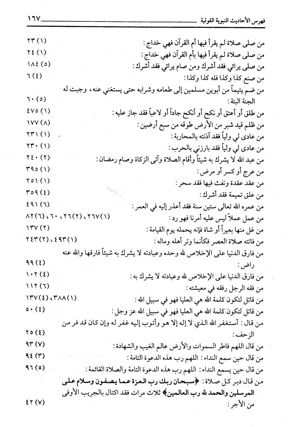 مَنْ صَلَّى صَلَاةً لَمْ يَقْرَأْ فِيهَا أُمَّ القرآن فهي خداج: (1) 23 مَنْ صَلَّى صَلَاةً لَمْ يَقْرَأْ فِيهَا بِأُمِّ القرآن فهي خداج: (1) 24 مَنْ صَلَّى يُرَائِي فَقَدْ أَشْرَكَ وَمَنْ صَامَ يرائي فقد أشرك: (5) 184 مَنْ صَنَعَ كَذَا وَكَذَا فَلَهُ كَذَا وَكَذَا: (4) 6 من ضم يتيما من أَبَوَيْنِ مُسْلِمَيْنِ إِلَى طَعَامِهِ وَشَرَابِهِ حَتَّى يَسْتَغْنِيَ عنه، وجبت له الجنة البتة: (5) 60 مَنْ طَلَّقَ أَوْ أَعْتَقَ أَوْ نَكَحَ أَوْ أَنْكَحَ جَادًّا أَوْ لَاعِبًا فَقَدْ جَازَ عَلَيْهِ: (1) 475 مَنْ ظَلَمَ قَيْدَ شِبْرٍ مِنَ الْأَرْضِ طُوِّقَهُ من سبع أرضين: (8) 177 من عادى لي وليا فقد آذنته بالمحاربة: (1) 231 مَنْ عَادَى لِي وَلِيًّا فَقَدْ بَارَزَنِي بِالْحَرْبِ: (1) 230 مَنْ عَبَدَ اللَّهَ لَا يُشْرِكُ بِهِ شَيْئًا وأقام الصلاة وآتى الزكاة وصام رمضان: (2) 240 من عرج أو كسر أو مرض: (1) 395 مَنْ عَقَدَ عُقْدَةً وَنَفَثَ فِيهَا فَقَدْ سَحَرَ: (1) 251 من علق تميمة فقد أشرك: (4) 359 من عمره الله تعالى سِتِّينَ سَنَةً فَقَدْ أَعْذَرَ إِلَيْهِ فِي الْعُمْرِ: (6) 491 مَنْ عَمِلَ عَمَلًا لَيْسَ عَلَيْهِ أَمْرُنَا فَهُوَ رد: (1) 267، (2) 26، 60، (6) 82 مَنْ غَلَّ مِنْهَا بَعِيرًا أَوْ شَاةً فَإِنَّهُ يحمله يوم القيامة: (2) 137 مَنْ فَاتَتْهُ صَلَاةُ الْعَصْرِ فَكَأَنَّمَا وَتِرَ أَهْلَهُ وماله: (1) 493، (2) 243 مَنْ فَارَقَ الدُّنْيَا عَلَى الْإِخْلَاصِ لِلَّهِ وَحْدَهُ وَعِبَادَتِهِ لَا يُشْرِكُ بِهِ شَيْئًا فَارَقَهَا وَاللَّهُ عنه راض: (4) 99 مَنْ فَارَقَ الدُّنْيَا عَلَى الْإِخْلَاصِ لِلَّهِ وَعِبَادَتِهِ لا يشرك به: (4) 102 من فقه الرجل رفقه في معيشته: (6) 112 مَنْ قَاتَلَ لِتَكُونَ كَلِمَةُ اللَّهِ هِيَ الْعُلْيَا فهو في سبيل الله: (1) 388، (4) 137 مَنْ قَاتَلَ لِتَكُونَ كَلِمَةُ اللَّهِ هِيَ الْعُلْيَا فهو في سبيل الله عز وجل: (4) 50 مَنْ قَالَ: أَسْتَغْفِرُ اللَّهَ الَّذِي لَا إِلَهَ إِلَّا هُوَ وَأَتُوبُ إِلَيْهِ غُفِرَ لَهُ وَإِنْ كان قد فر من الزحف: (4) 25 من قال اللَّهُمَّ فَاطِرَ السَّمَوَاتِ وَالْأَرْضِ عَالِمَ الْغَيْبِ وَالشَّهَادَةِ: (7) 93 من قال حين سمع النداء: اللهم رب هذه الدعوة التامة: (3) 94 مَنْ قَالَ حِينَ يَسْمَعُ النِّدَاءَ: اللَّهُمَّ رَبَّ هذه الدعوة التامة والصلاة القائمة: (5) 96 مَنْ قَالَ دُبُرَ كُلِّ صَلَاةٍ: سُبْحانَ رَبِّكَ رَبِّ الْعِزَّةِ عَمَّا يَصِفُونَ وَسَلامٌ عَلَى الْمُرْسَلِينَ وَالْحَمْدُ لِلَّهِ رَبِّ الْعالَمِينَ ثَلَاثَ مَرَّاتٍ فَقَدِ اكتال بالجريب الأوفى من الأجر: (7) 42